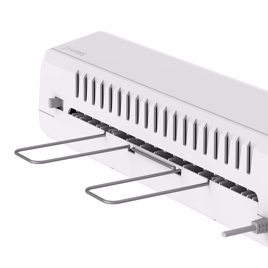 Plastificatrice a 2 rulli riscaldati - 4 impostazioni della temperatura (75,100, 125) e a freddo - leva per sblocco inceppamenti - fredda al tocco grazie al doppio sistema di isolamento con tecnologia Heatguard - spia pronto macchina
