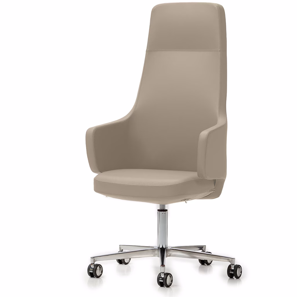 Direzionale nella versione con schienale alto. Imbottiture in poliuretano stampato a freddo autoestinguente. Braccioli integrati allo schienale. Struttura interna del sedile in legno certificato Fsc. Meccanismo synchron multiblocco con traslatore e base a cinque razze in alluminio lucido su ruote piroettanti gommate autofrenanti Ø 65mm cromate. Tramite supplemento è possibile prevedere il supporto lombare integrato nello schienale oppure prevederla con il meccanismo synchron autopesante. RIVESTIMENTI Proposta in tinta unita con vera pelle e tramite supplemento nella versione bicolor.