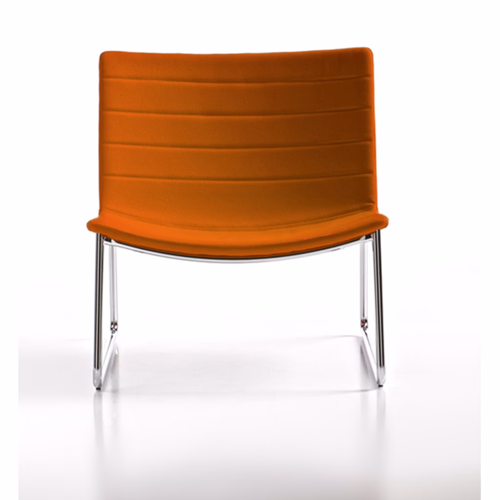 Caratterizzata da una linea essenziale, di spiccata versatilità, ideale per la casa, il contract e lufficio. Monoscocca in multistrato di faggio, imbottita in poliuretano espanso, rivestita con cuciture trasversali. Versione poltrona lunge su telaio a slitta cromato. Abbinabile alla versione sedia appartenente alla stessa collezione. Rivestimento in ecopelle ignifuga Planet (test usura 100.000 cicli Martindale) colore arancione