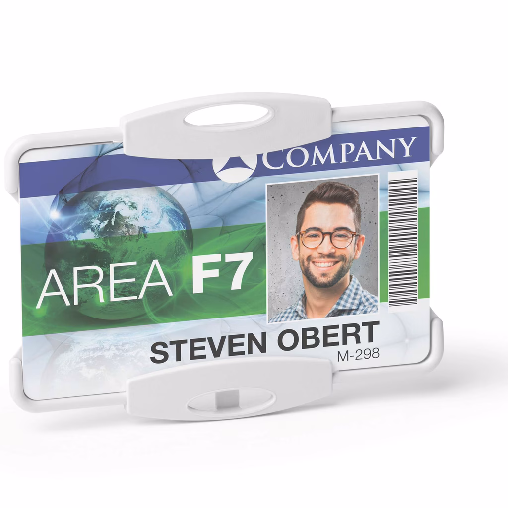 Porta badge in rigido polistirene di alta qualità per badge, tessere magnetiche e pass. Ideato con il lato porta badge/tessera aperto per agevolare la lettura dei chip. Ideale per il rilevamento delle presenze a radiofrequenza (RFID) o per la timbratura tramite terminali a prossimità. Utilizzabile sia in posizione orizzontale che verticale. Realizzato in robusta plastica riciclata certificata Blue Angel. Utilizzabile con clip, cordoncino in tessuto o chiocciola yo-yo. Inserimento facilitato che non danneggia la banda magnetica. Disponibile nella versione per una e due tessere.