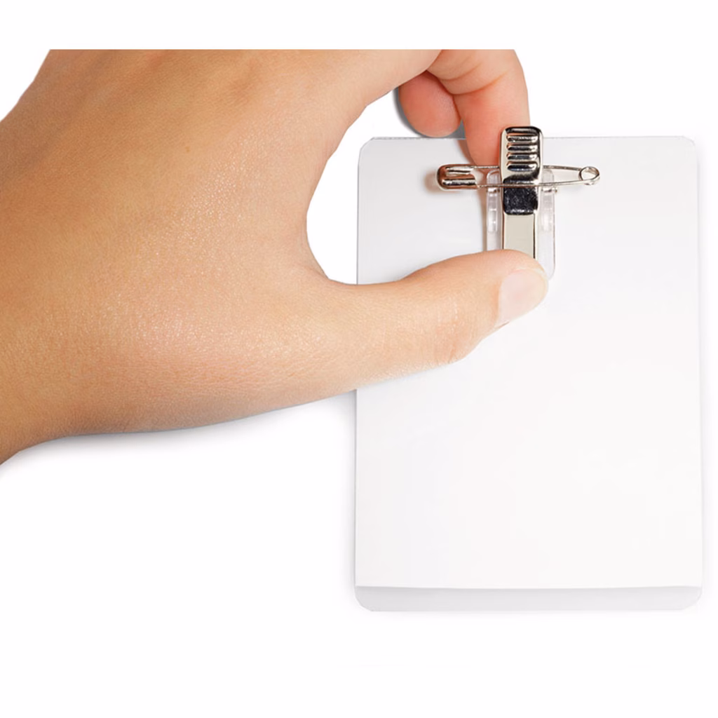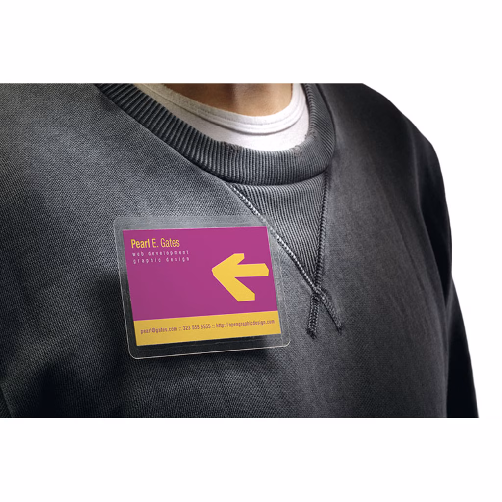 Portanome in polipropilene plastificabile a freddo, dotato di combi clip adesiva applicabile sia in orizzontale che in verticale, secondo l'esigenza. Plastificazione rapida e semplice: rimuovere la pellicola di protezione, inserire il biglietto da visita o inserto e premere per sigillare. Inserto in cartoncino non incluso. Formato inserto: fino a 54 x 90 mm (HxL).