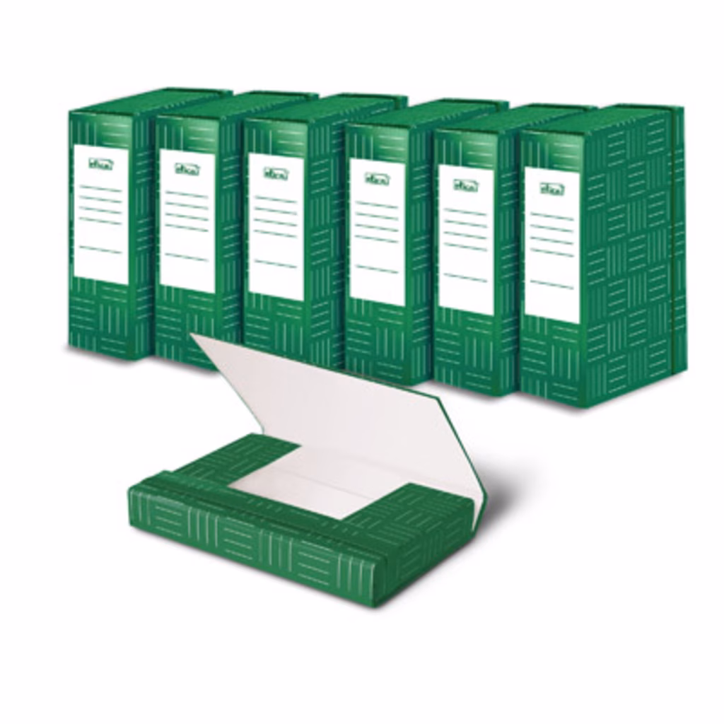 Scatola a 3 alette in pesante cartone rivestito (certificato FSC®) - dorso e lembi cordonati - chiusura con elastico piatto - superficie sottoposta a trattamento di vetrificazione per un'alta resistenza alla polvere e all'umidità - dorso scrivibile con pennarello permanent