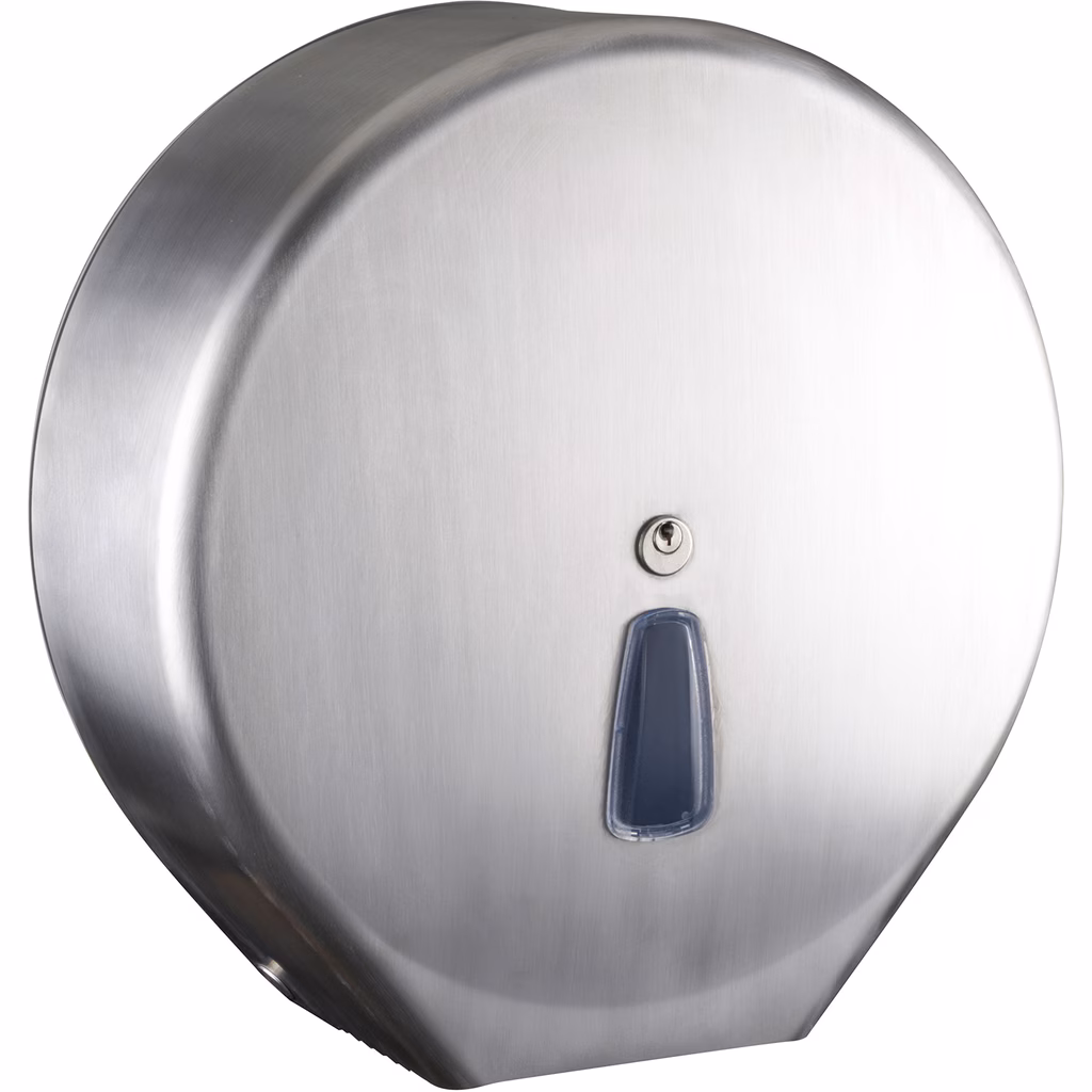 Dispenser Inox satinato MARPLAST JUMBINOX MAXI percarta igienica maxi jumbo - a muro con tasselli in dotazione, può contenere un rotolo di carta igienica diametro max 280 mm. - serratura metallica a chiave