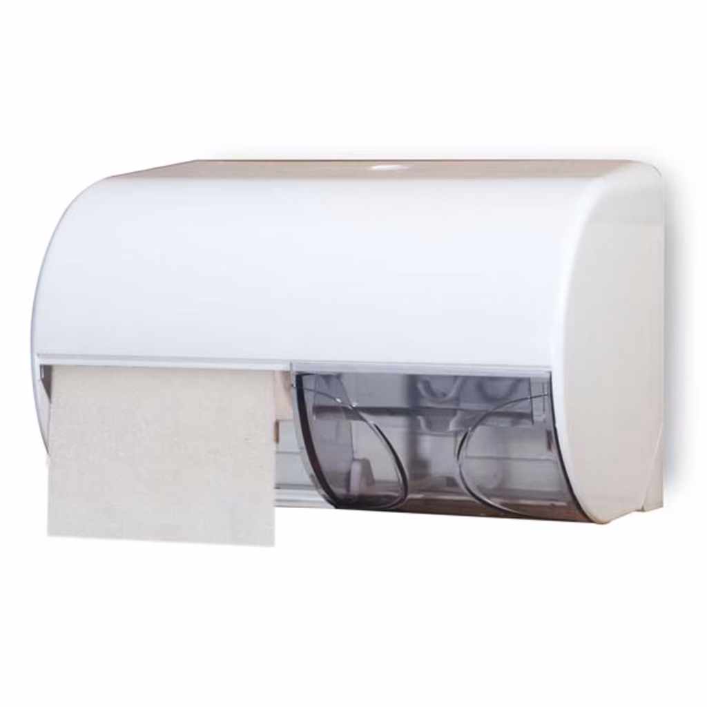Dispenser doppio rotolo per carta igienica, in ABS antiurto - vetrino scorrevole a ritorno automatico - per rotoli diametro mm 120 e altezza mm 100