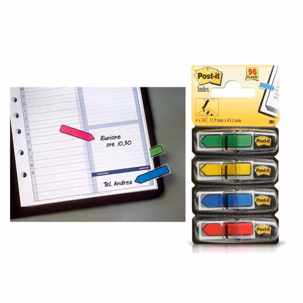 Miniset di segnapagina frecce - riposizionabile e superficie scrivibile - utilizzabile come ricarica di tutti i dispenser Post-it® Index - 1 blister da 96 bandierine freccia in 4 colori assortiti - formato cm 1,2x4,32