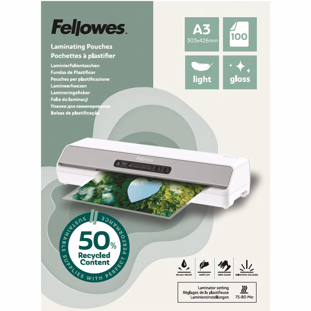 Realizzate con il 50% di contenuto riciclato (35% minimo post-consumo,15% pre-consumo). Confezione da 100 buste a finitura lucida. Uso leggero: per luso con limpostazione della plastificatrice a 75/80 micron.
