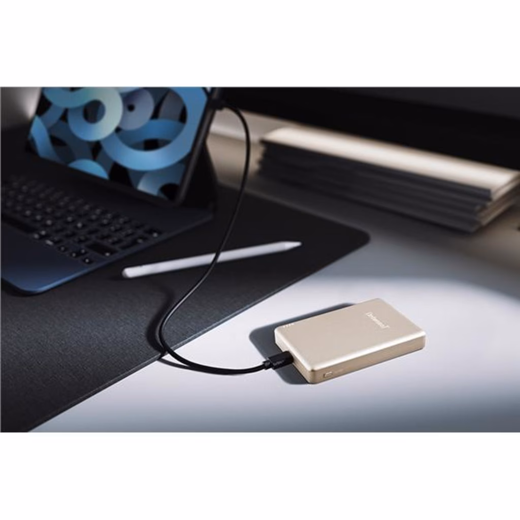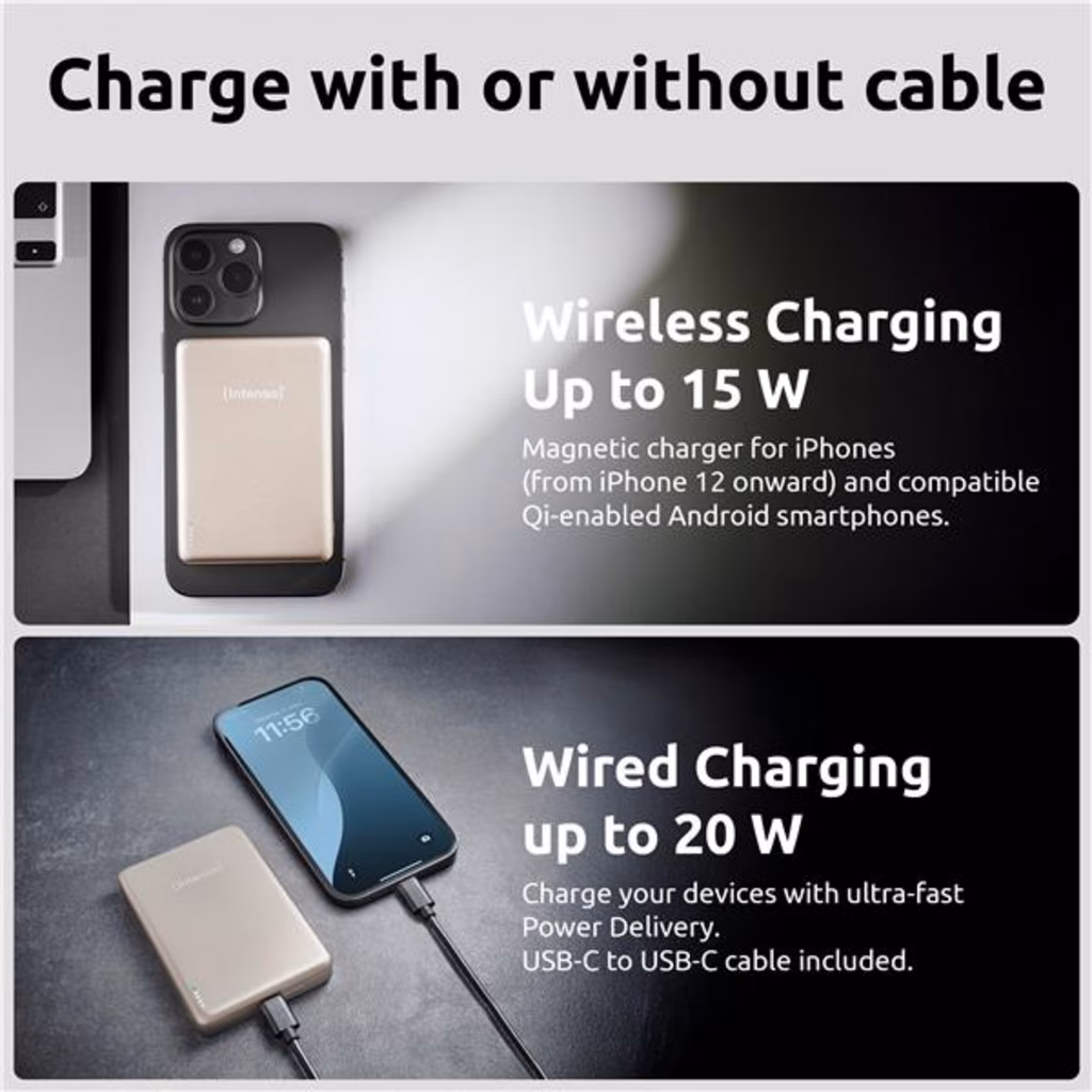 Intenso MW10000 Polimeri di litio (LiPo) 10000 mAh Carica wireless Champagne Completamente carica. Con o senza cavi. I powerbank MW5000 e MW10000 di Intenso forniscono energia mobile nella sua forma più elegante. Dotati di batterie ai polimeri di litio ad alte prestazioni rispettivamente da 5.000 e 10.000 mAh, consentono una ricarica rapida e sicura dei dispositivi moderni, siano essi smartphone, tablet o dispositivi compatibili con Qi. Grazie alla tecnologia Power Delivery integrata, forniscono una potenza fino a 20 W tramite USB-C e fino a 15 W in modalità wireless. Perfetti per chi apprezza le prestazioni elevate in movimento. Design ultrasottile. Disponibile in tre colori. Grazie alle loro dimensioni ultrasottili (solo 9,5 mm per MW5000 e 16 mm per MW10000), questi powerbank si adattano facilmente a qualsiasi tasca. Disponibili in eleganti colori champagne, rosa o grigio, sono perfetti per ogni occasione. Grazie alla compatibilità con MagSafe (da iPhone 12 in poi), si agganciano magneticamente al dispositivo e si ricaricano tramite le custodie compatibili: una vera comodità per tutti i giorni. Quattro LED di stato e un LED di funzione indicano in modo affidabile il livello di carica attuale e la modalità operativa.