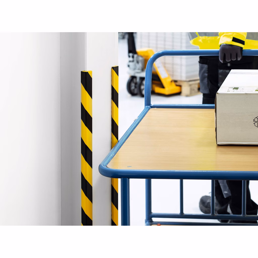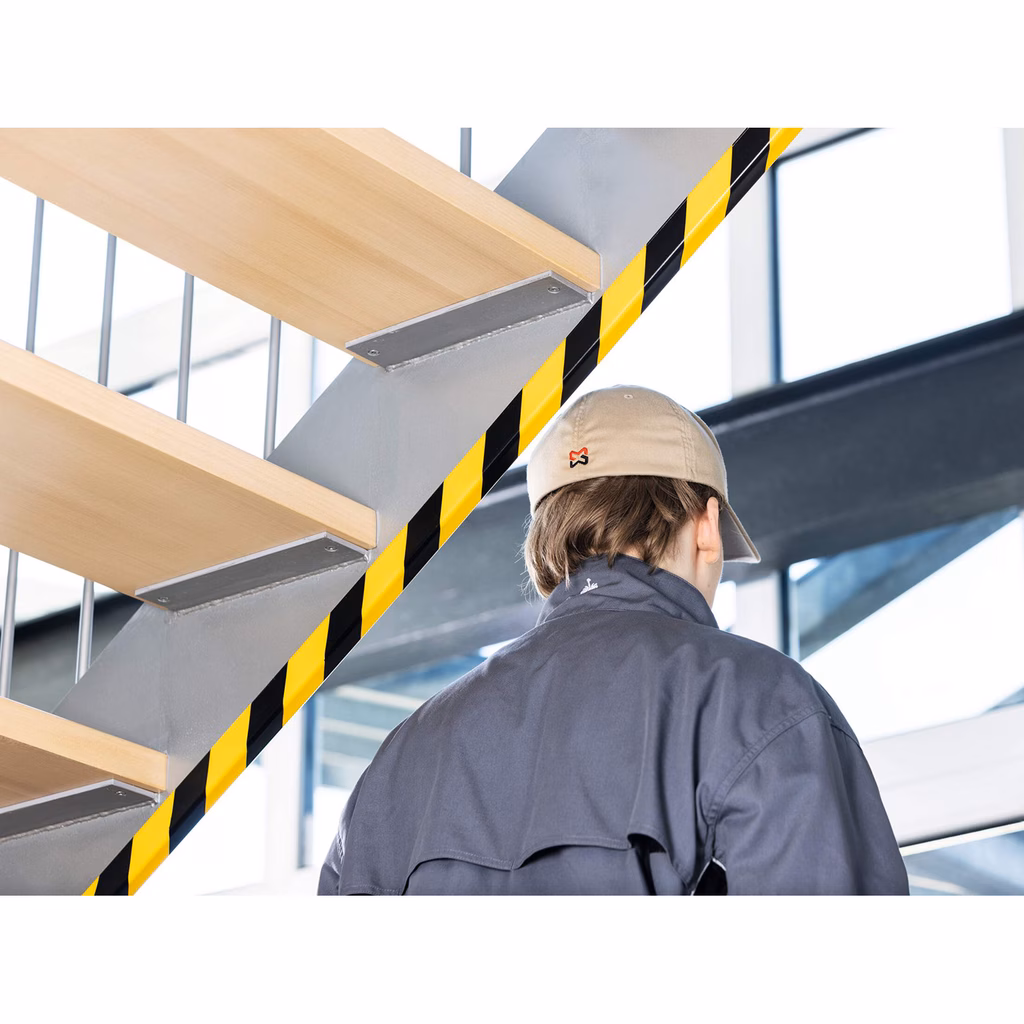 Profilo di protezione adesivo in schiuma poliuretanica flessibile 100% riciclabile - Utilizzabile in ambienti interni come aree di produzione, reparti spedizioni e magazzini, scantinati, scale, garage,su pareti e travetti, scaffali e armadi, nonché su macchine, carrelli di stoccaggio, ecc. - Adatto per segnalare punti pericolosi, proteggere superfici e pareti e prevenire infortuni dovuti a urti - Resistente adesivo lungo tutto il retro del profilo - i profili possono essere tagliati alla lunghezza desiderata - Colore simile a RAL 1004/9003 (giallo segnale/nero segnale) - Classe di incendio conforme alla norma DIN EN 13501-1 / classe E- Resistente a temperature da -30°C a +70°C