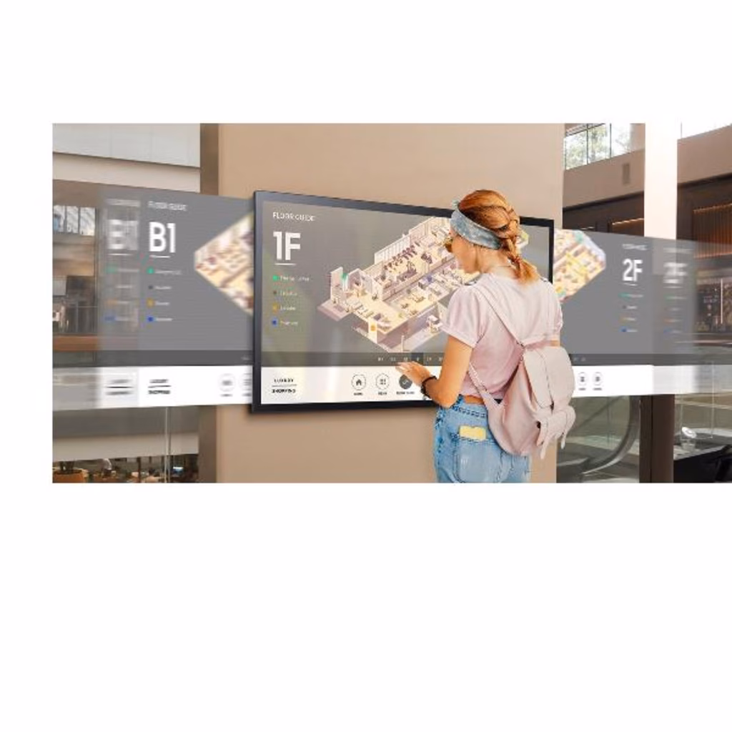 Monitor: E-LED BLU 32'', Risoluzione 1920x1080, Pixel pitch 0.3638x0.3638 mm, Luminosità: 300 cd/m2 (with touch glass), Contrasto: 5000:1. Angolo di visuale 178/178, Tempo di risposta: 8ms, Operatività 16/7, Haze 2% (Without Glass); Audio: Speaker Integrati (10W+10W); Input: Display Port 1.2 (1), HDMI 2.0 (2), HDCP 2.2, HDMI, USB 2.0 x 2. Output: HDMI 2.0 (Loop-out), Stereo mini Jack. Controllo remoto: RS232C(in/out) thru stereo jack, RJ45; Sensore Esterno: IR; Dimensioni: 744.4 X 444.6 X 48.2 mm, Peso: 8.3 kg, VESA Mount 200x200, Spessore Cornice: 24.5 (T/D), 21.5 (L/R); Feature: Built-in MagicInfo S6 powered by Tizen 4.0, SSSP 6.0, WiFi B/T