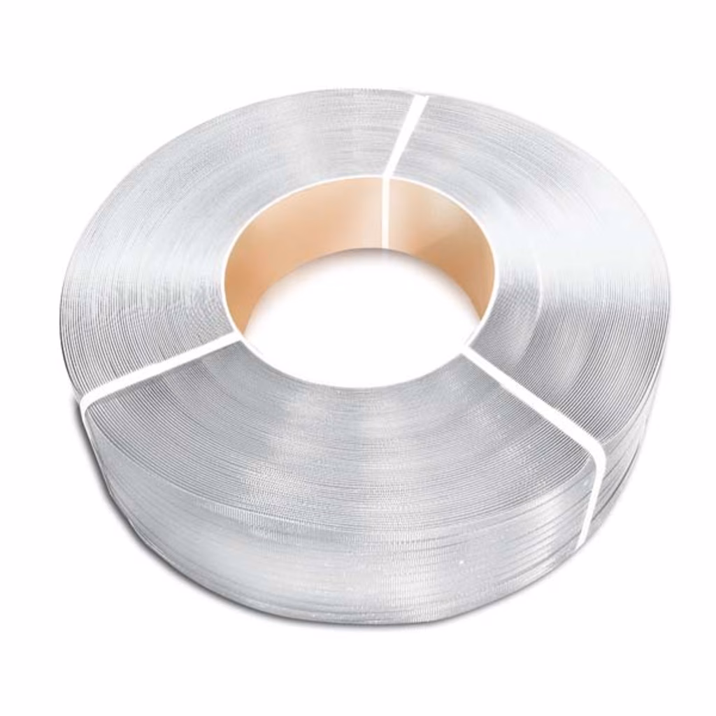 Reggia in polipropilene consigliata per le reggettature più comuni - Si adatta ad ogni forma d'imballaggio senza deformarsi, perchè più malleabile della reggia in ferro - Reggia in polipropilene per imballo con impronta zigrinata - larghezza mm 12, spessore mm 0,5, bobina da m 1000, diametro interno bobina mm 62, diametro esterno bobina cm 25 - peso kg 4,2 - colore bianco