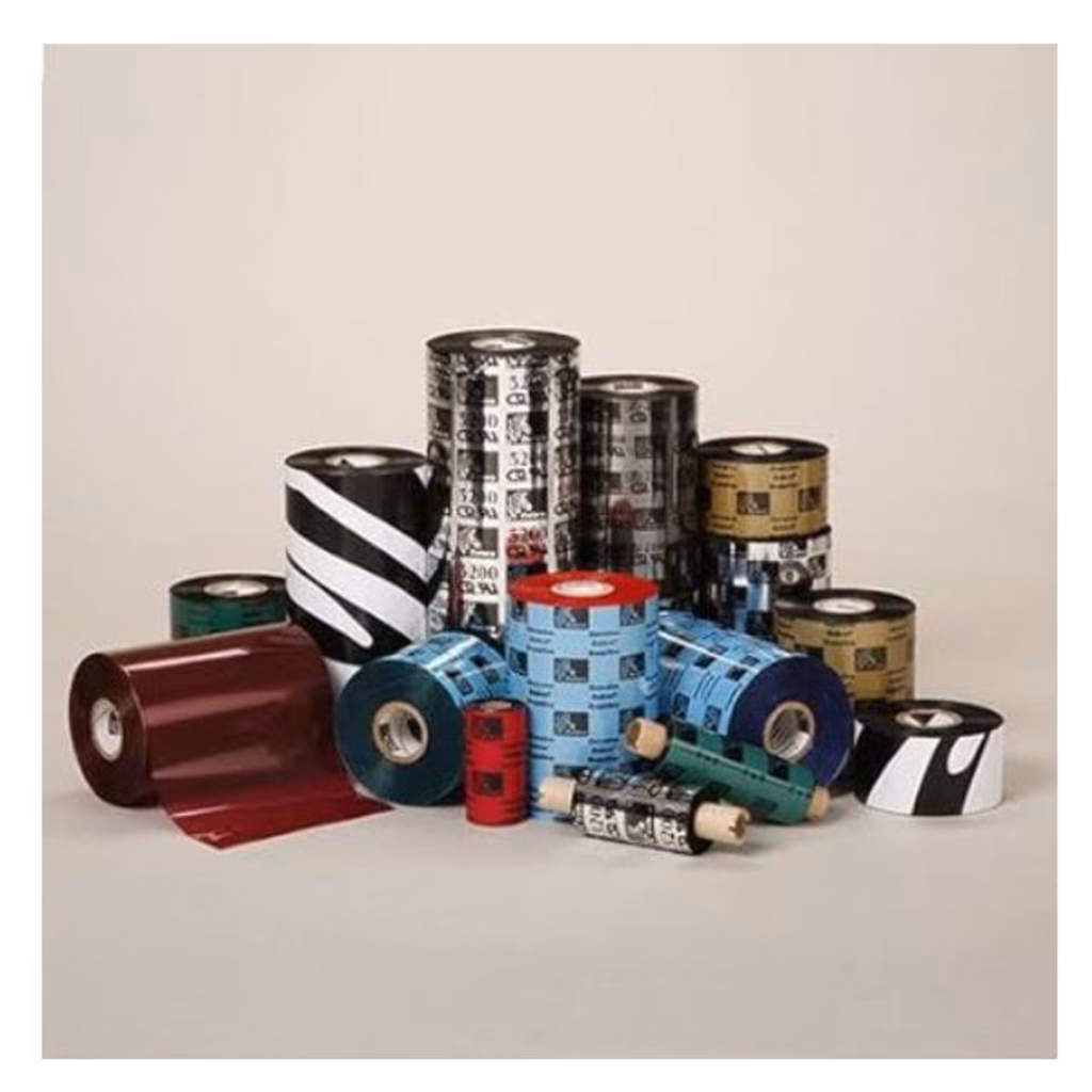 Immagine di Kit stampa: 3 nastri ttr in resina mm 110x450 e 3 rotoli da 1760 etichette trasp mm 75x35 zebra