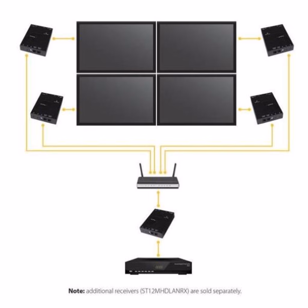 Questo ricevitore HDMI® over IP funziona con il kit extender HDMI over IP (venduto separatamente) e permette di estendere un segnale HDMI sulla rete. È possibile utilizzare ricevitori supplementari (venduti separatamente) per distribuire un segnale HDMI a più punti e combinare i display remoti per creare una parete video.