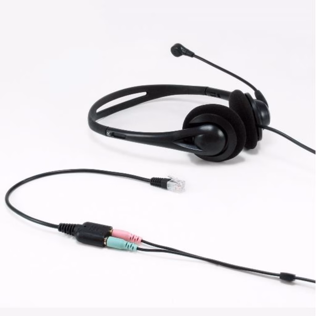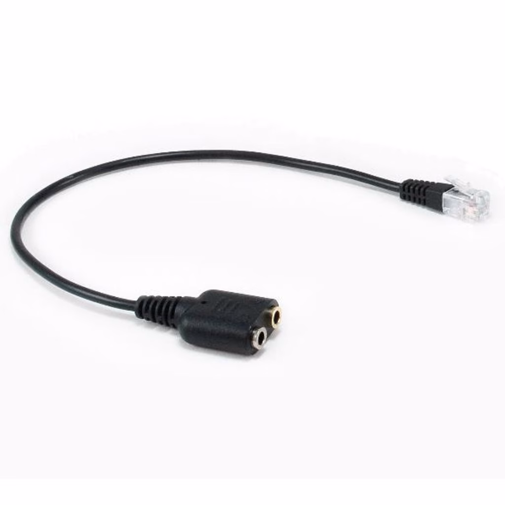 Il cavo è dotato di un doppio jack da 3,5 mm per cuffie o auricolari per PC che possono poi essere collegati ai telefoni RJ9.