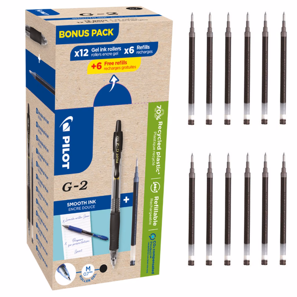 Green Pack, scatola in cartone riciclato al 100%. La confezione contiene 12 roller inchiostro gel G-2 0,7 realizzata con almeno il 50% di plastica riciclata e 6+6 refill omaggio. Punta mm 0,7 - tratto mm 0,39
