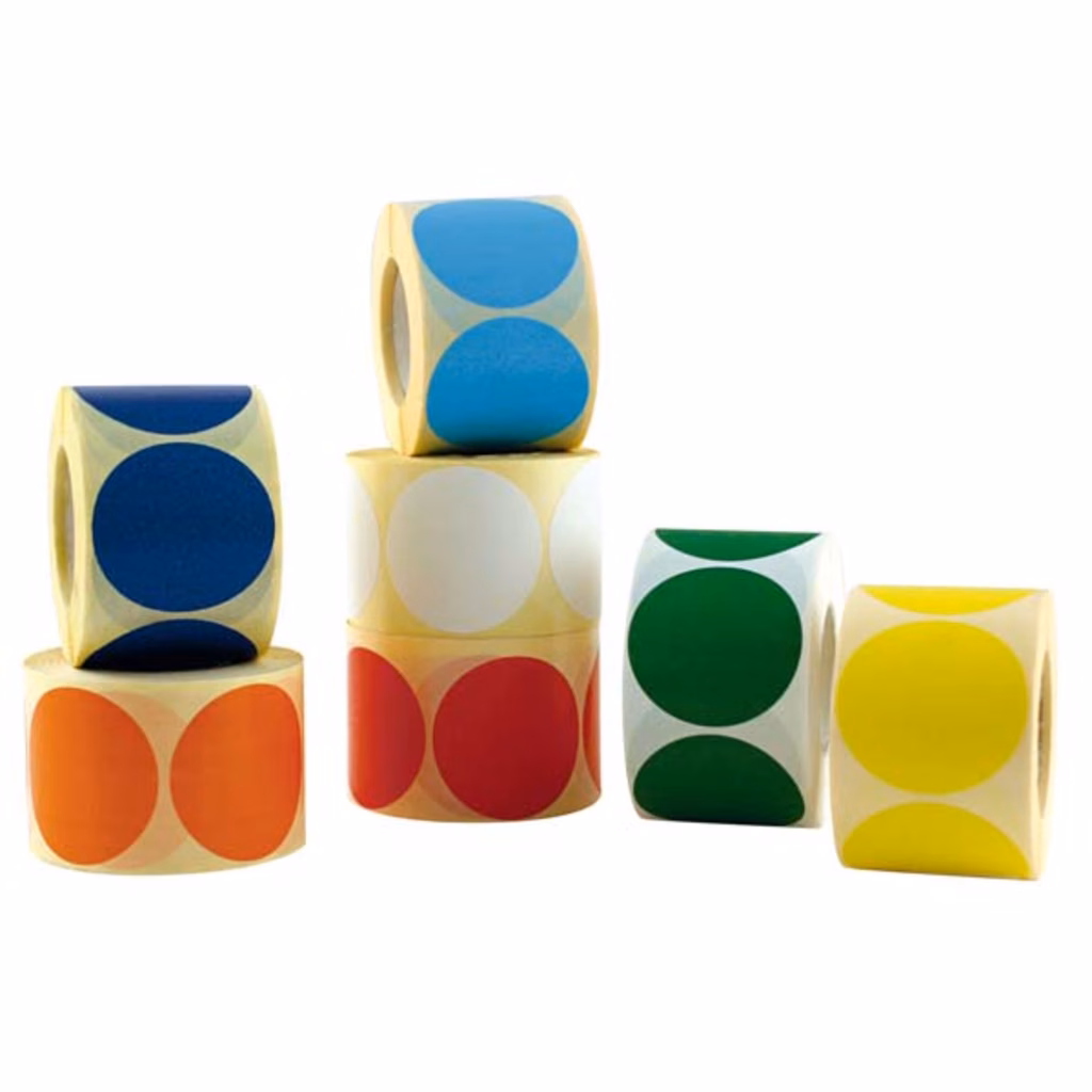 Etichette adesive di segnalazione tonde diametro mm 35 - ideali per la gestione dei prodotti nello stoccaggio - in rotoli da 500 etichette pronte all'uso
