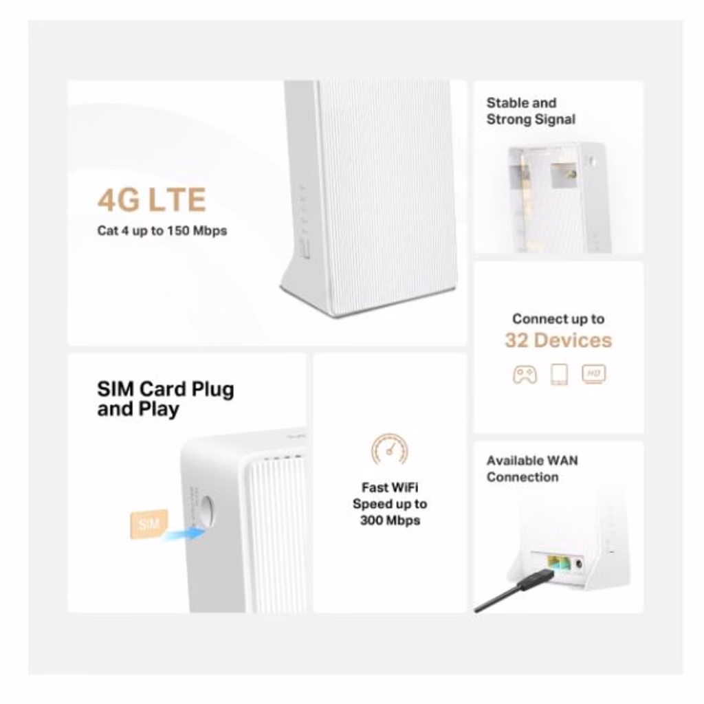 N300 Wi-Fi 4G LTE Router, Build-In 150Mbps 4G LTE Modem, 300 Mbps at 2.4 GHz, 4G Cat4 150/50 Mbps, Internal Antennas, Extra 3G/4G Antenna Ports, 1× 10/100 Mbps LAN Port, 1× 10/100 Mbps WAN/LAN Port, FDD-LTE (B1/B3/B5/B7/B8/B20/B28), TDD-LTE (B38/B40), HSPA+/UMTS (B1/B5/B8), MERCUSYS APP, SIM Card Plug and Play, 3G/4G Router/Wi-Fi Router Mode, IPTV, IPv6, Parental Controls