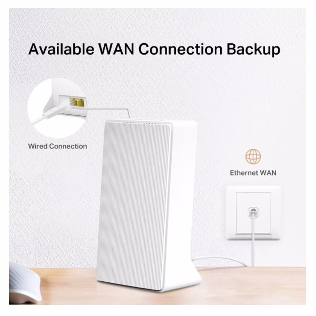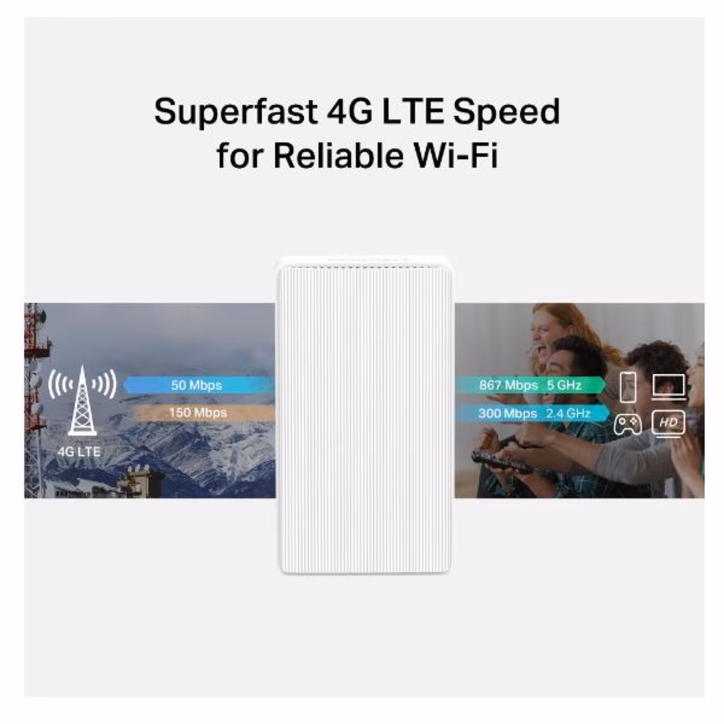 AC1200 Wi-Fi 4G LTE Router, Build-In 150Mbps 4G LTE Modem, 300 Mbps at 2.4 GHz, 867 Mbps at 5 GHz, 4G Cat4 150/50 Mbps, Internal Antennas,  Extra 3G/4G Antenna Ports, 1× 10/100 Mbps LAN Port, 1× 10/100 Mbps WAN/LAN Port, FDD-LTE (B1/B3/B5/B7/B8/B20/B28), TDD-LTE (B38/B40), HSPA+/UMTS (B1/B5/B8), MERCUSYS APP, Nano SIM Card Plug and Play, 3G/4G Router/Wi-Fi Router Mode, IPTV, IPv6, Parental Controls