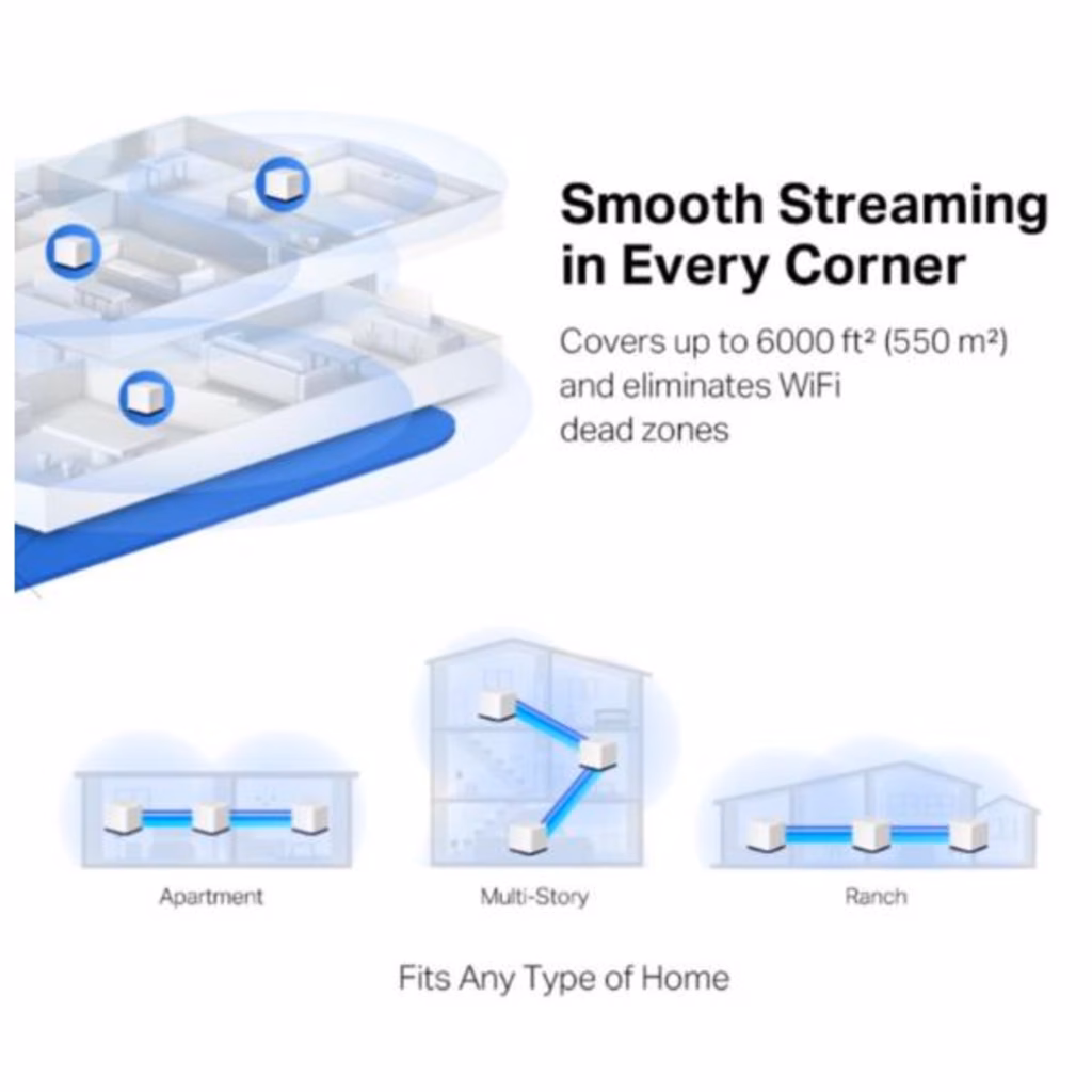 Copertura ottimale Il kit da 3 unità raggiunge una copertura Wi-Fi fino a 550 m², ideale per case di grandi dimensioni.