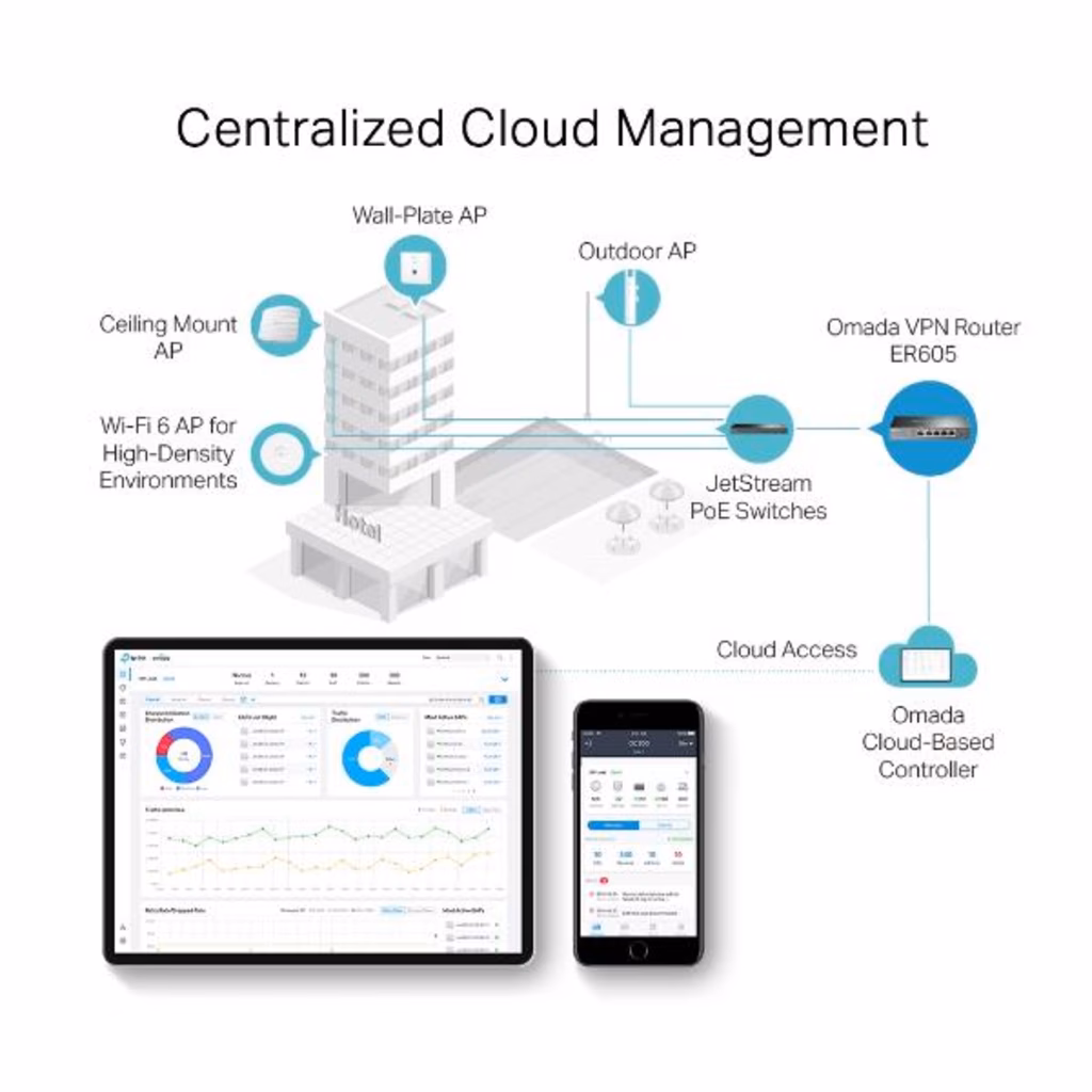 Integrated into Omada SDN: Zero-Touch Provisioning (ZTP), Centralized Cloud Management, and Intelligent Monitoring.
