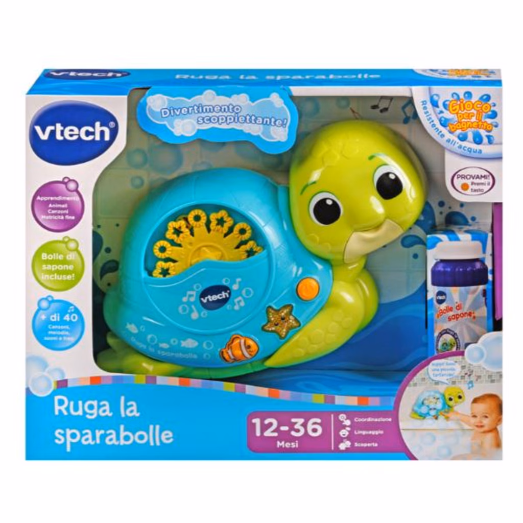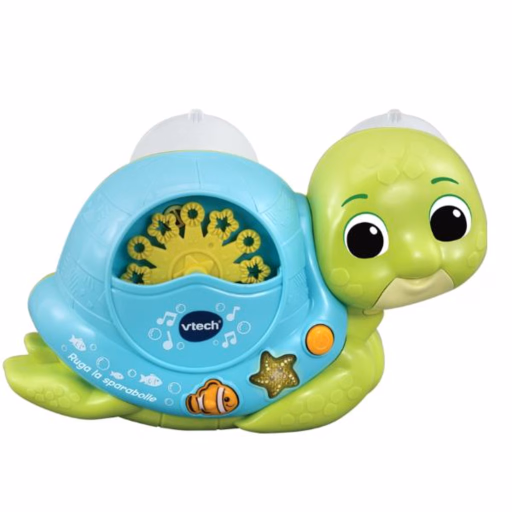 Ruga la sparabolle è la compagna perfetta per il tuo bambino nel momento del bagnetto del bagnetto! Magica! La tartarughina crea e spara le bolle e grazie ai suoi 2 pulsanti interattivi attiva frasi, canzoni, melodie e suoni divertenti! Grazie alle due ventose, Ruga può attaccarsi alla parete della vasca da bagno, facilitando e rendendo più sicure le interazioni con il tuo bambino.