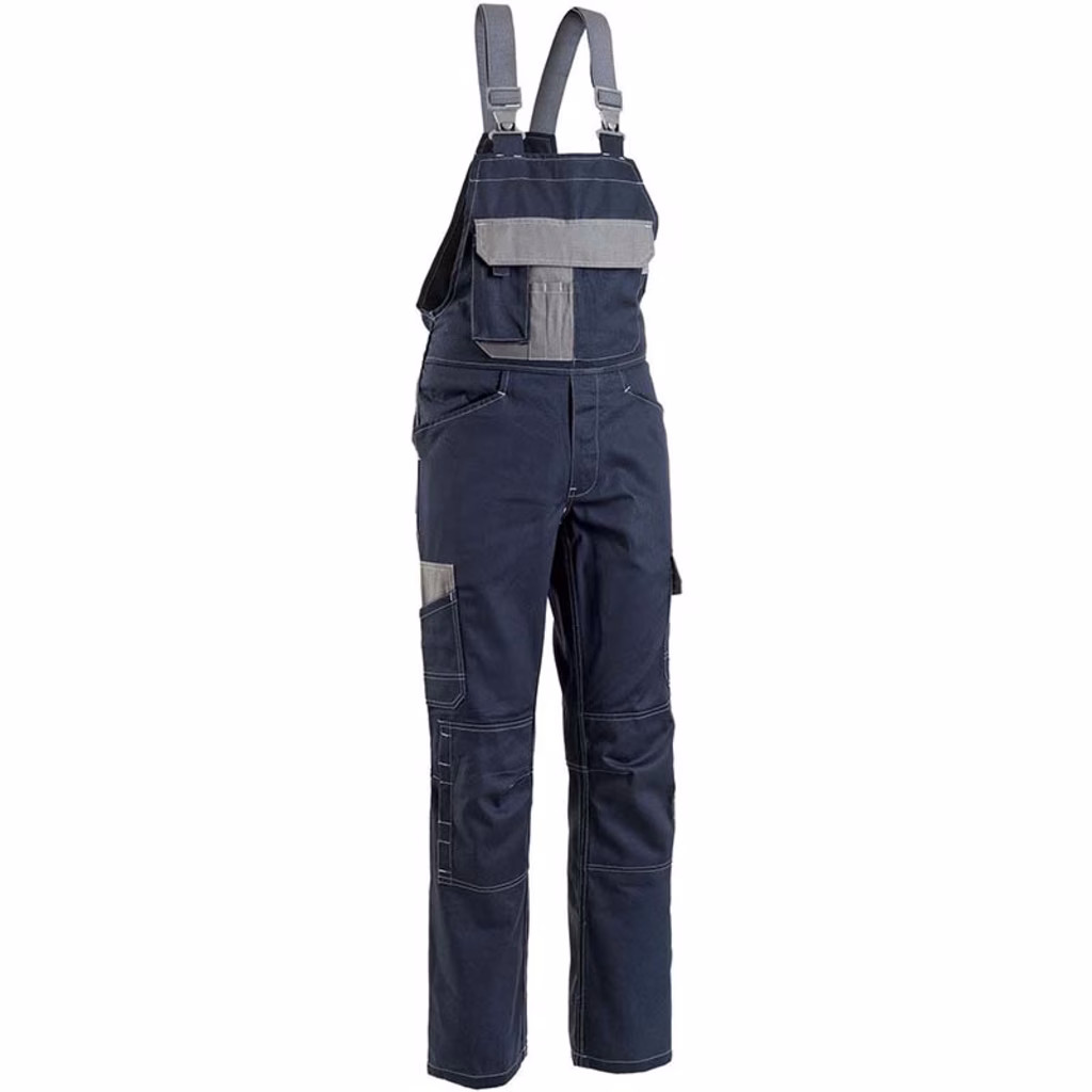 Salopette lavoro modello Globo con cerniera laterale - bretelle elasticizzate - ganci in plastica - due tasche anteriori - due tasche posteriori con velcro - tascone frontale con portapenne e portacellulare - tascone con pattina su gamba sinistra - doppia tasca applicata su gamba destra - aperture per inserimento protezioni alle ginocchia