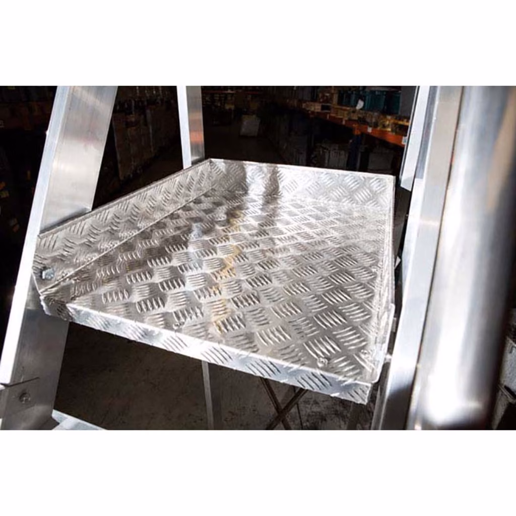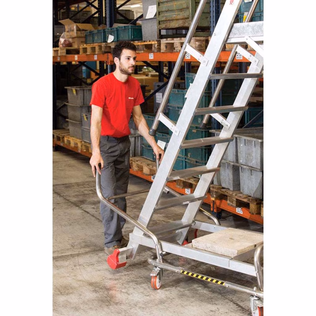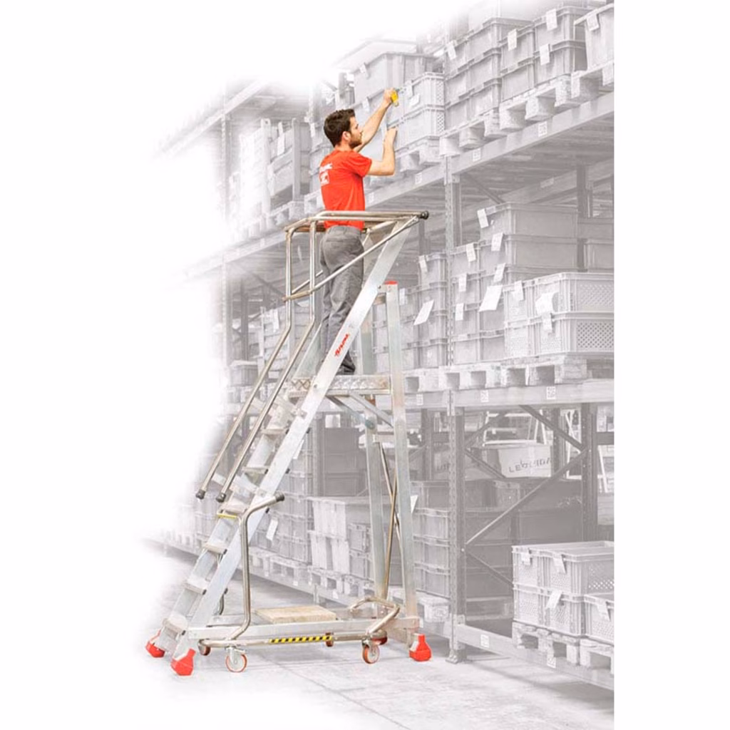 Disponibile da 4 a 15 gradini - Altezza massima di lavoro 5,4 m - Costruita in base alla norma EN 131.7, supera il test di ribaltamento laterale rendendo la piattaforma sicura per lavorare - Supera i test di resistenza di oltre 50.000 cicli di lavoro - Testata dal Politecnico di Milano, ogni scala è dotata del certificato di conformità e collaudo - Il comodo piano di lavoro antiscivolo in alluminio mandorlato (52x62) dona all'operatore ampio spazio di manovra - Il corrimano laterale in tubolare di alluminio sagomato consente all'operatore una presa sicura - La croce stabilizzatrice nell'asse posteriore migliora la stabilità della scala - COMFORT: Comodi gradini da 15 cm, L'inclinazione della scala di 60° rende la salita e la discesa agevole, Spostamento comodo e rapido grazie alle ruote del sistema Sicur-Stop.