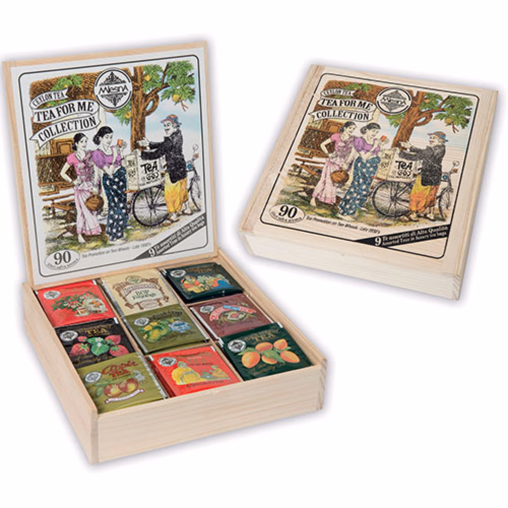 Tè in bustine confezionati in scatola regalo in legno - un'esclusiva collezione per soddisfare il tuo gusto in ogni occasione e per portare nella tua tazza tutti i sapori del tè di Ceylon - contiene 90 filtri da g 2 laminati salvaroma - gusti assortiti (10 bustine per gusto): Tè verde (benefico per il mattino), Loolecondera (gustoso e corposo per il pomeriggio), Orange Pekoe (leggero di alta montagna per la sera), Tè alla fragola, Tè alla mela, Tè alla pesca e all'albicocca (fruttati, ottimi caldi ma anche ghiacciati), Monks Blend (la miscela del Monaco che unisce la morbida vaniglia al frizzante melograno), Cream Earl Grey (che addolcisce il classico tè al bergamotto con un tocco di vaniglia), Tè verde al soursop (dissetante frutto tropicale dal gusto unico e freschissimo) - dimensioni scatola LxPxH cm 24,9x24,2x6