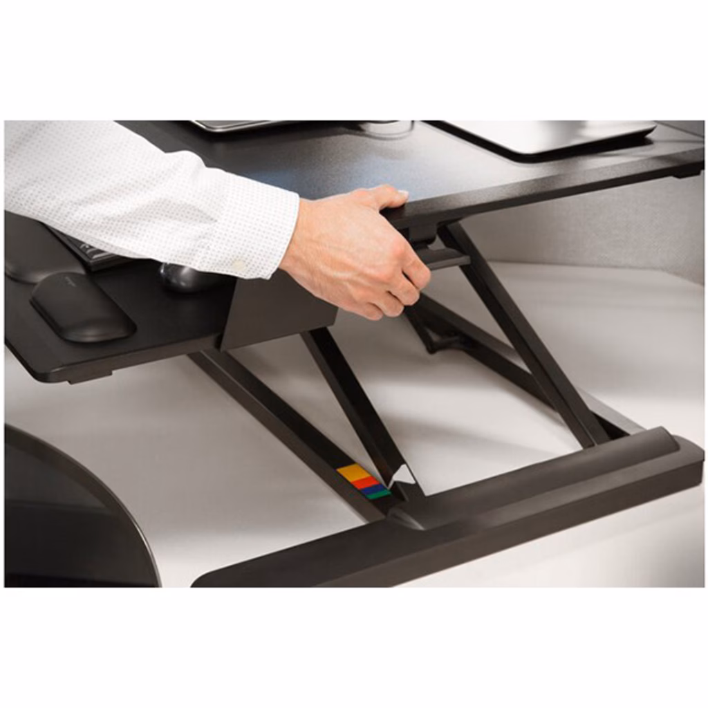 Scrivania ad assetto variabile SmartFit - completamente montata - la struttura professionale a due livelli offre una superficie della scrivania principale larga 900 mm con tutto lo spazio necessario per la configurazione di un doppio monitor, i documenti e altri accessori da scrivania, un deck per tastiera e mouse integrato e bordi arrotondati ergonomici per ridurre lo stress da contatto. - il sistema SmartFit® semplifica il posizionamento all'altezza ergonomica ideale basandosi su ricerche scientificamente provate per contribuire a evitare lesioni e aumentare il comfort - il sollevamento pneumatico con sistema di regolazione della tensione consente di regolare facilmente la tensione in base al peso applicato sulla postazione di lavoro, per una regolazione rapida e semplice tra la posizione seduta e in piedi