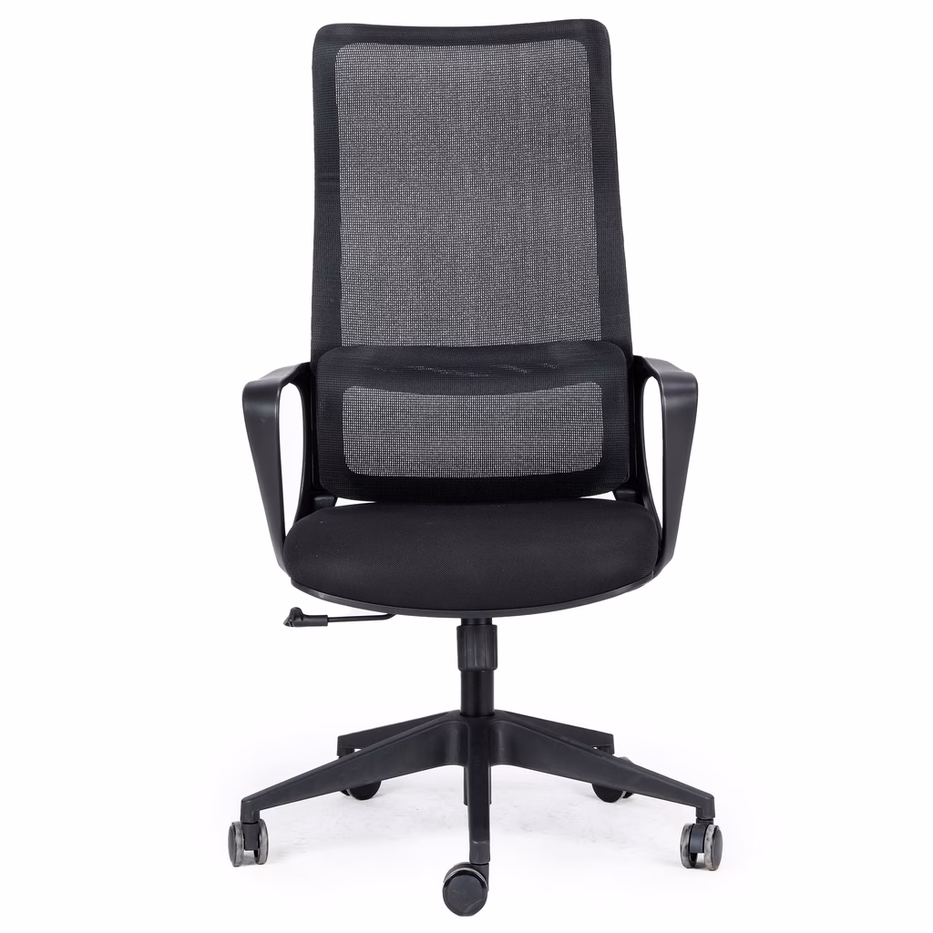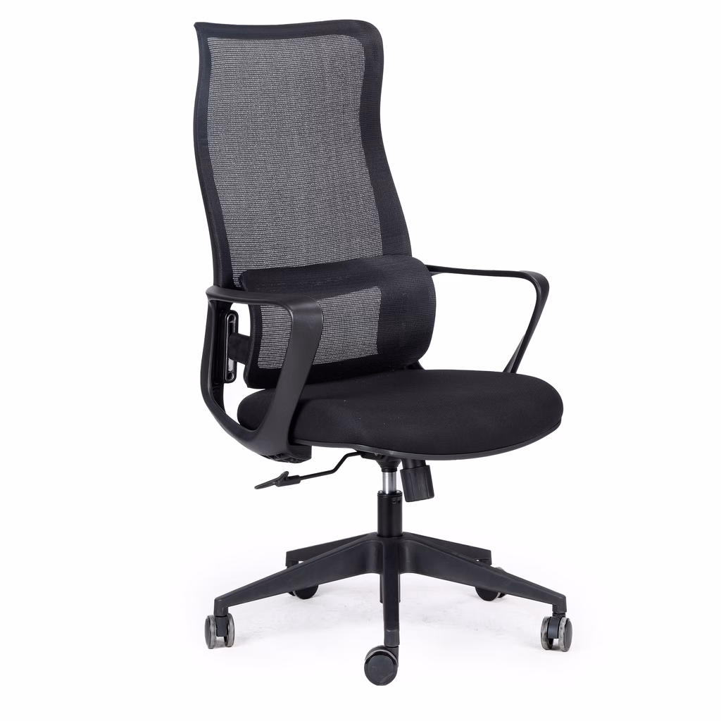 Schienale: alto ed ergonomico, struttura in nylon e rete portante ignifuga a norma BS, colore nero o grigio (tono su tono) - Supporto lombare: doppio schienale fisso - Sedile: in polipropilene ricoperto di resina poliuretanica densità 40kg/m3 e rivestito con tessuto (tono su tono) - Meccanismo: oscillante semplice 1 blocco - Braccioli: fissi in nylon (tono su tono) - Elevazione seduta: gaslift - Base: in nylon caricato diametro 700mm (tono su tono)- Ruote: libere in nylon diam. 60mm - Struttura e rete colore nero - Per uso direzionale
