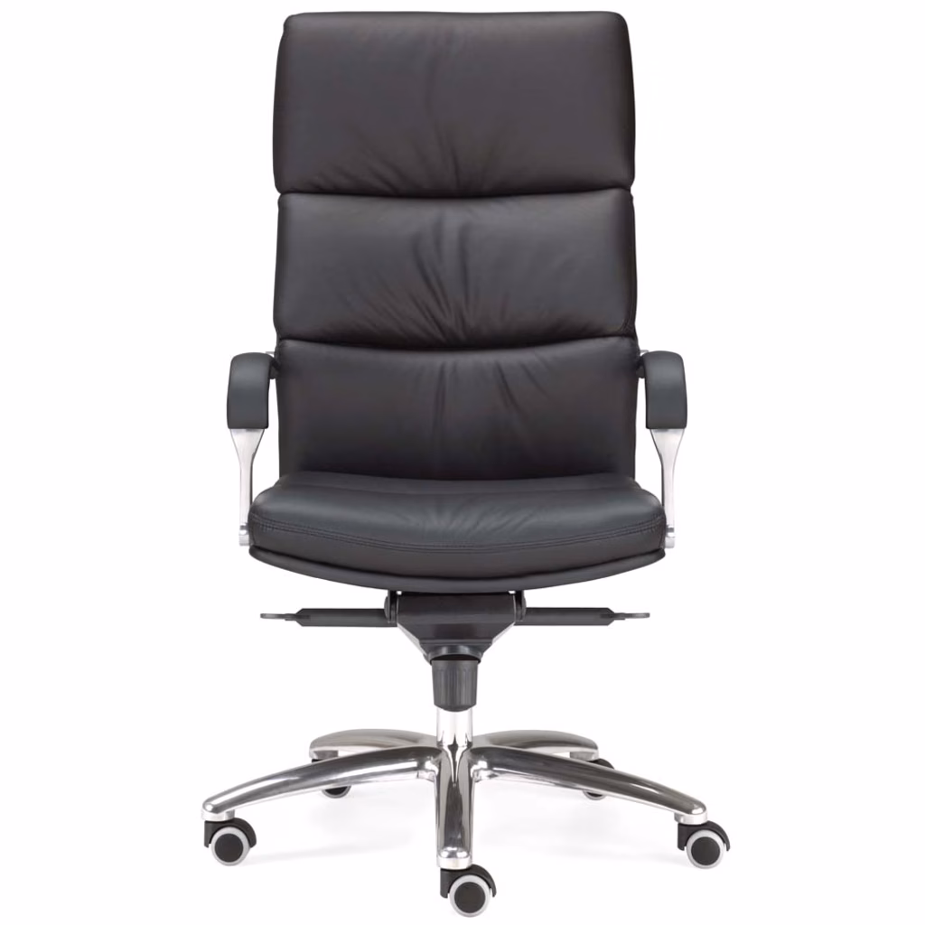 Sistema direzionale che garantisce il massimo in termini di ergonomia e comodità. I cuscini imbottiti si integrano con la struttura per un design destinato a durare nel tempo - poltrona direzionale classica caratterizzata dal particolare bracciolo in alluminio con pad imbottito e rivestito - Base: 5 razze in alluminio su ruote - Rivestimento: Ecopelle - Schienale: alto con movimento regolato da meccanismo oscillante a fulcro avanzato con possibilità di blocco in piu' posizioni e regolazione della resistenza dell'oscillazione in funzione del peso dell'utilizzatore - Garanzia 3 anni