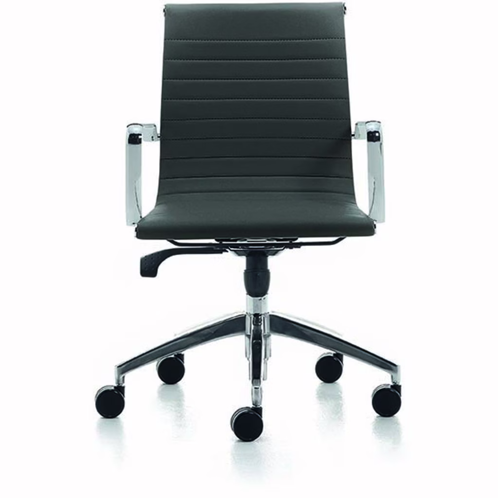 Monoscocca con struttura in acciaio cromato e rete autoportante - Imbottitura rivestita in ecopelle - Base a 5 razze in pressofusione d'alluminio lucido su ruote - Meccanismo oscillante con bloccaggio nella posizione di lettura - Regolatore di tensione di oscillazione - Braccioli e maniglia posteriore in pressofusione d'alluminio lucido - Schienale MEDIO - Certificata UNI EN 1335" C" - Garanzia 2 anni