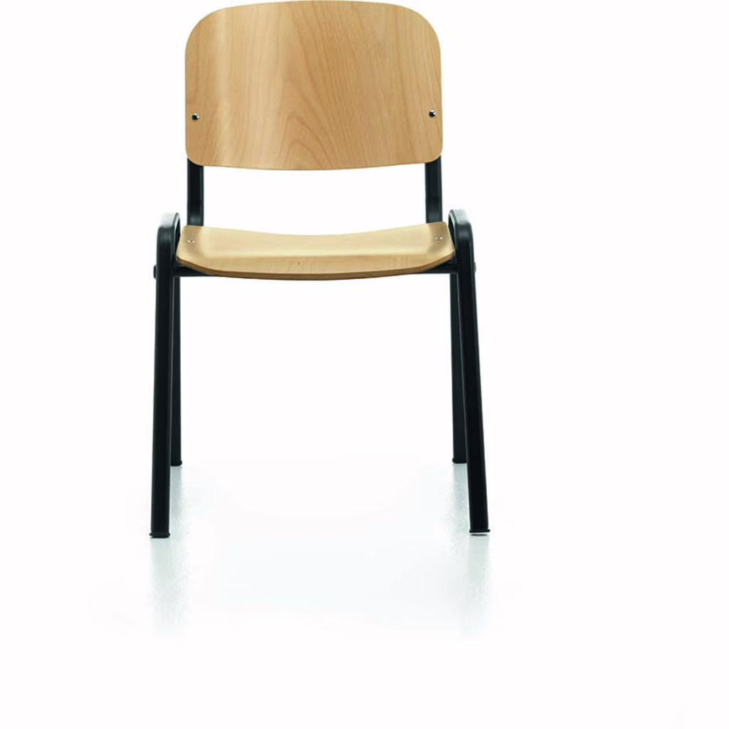 Seduta fissa impilabile con sedile e schienale in multistrato di legno ideale come sedia attesa o conferenza. Struttura in tubolare d'acciaio nella versione verniciata colore nero. Completabile con braccioli e scrittoio. Piedini in gomma antiscivolo.