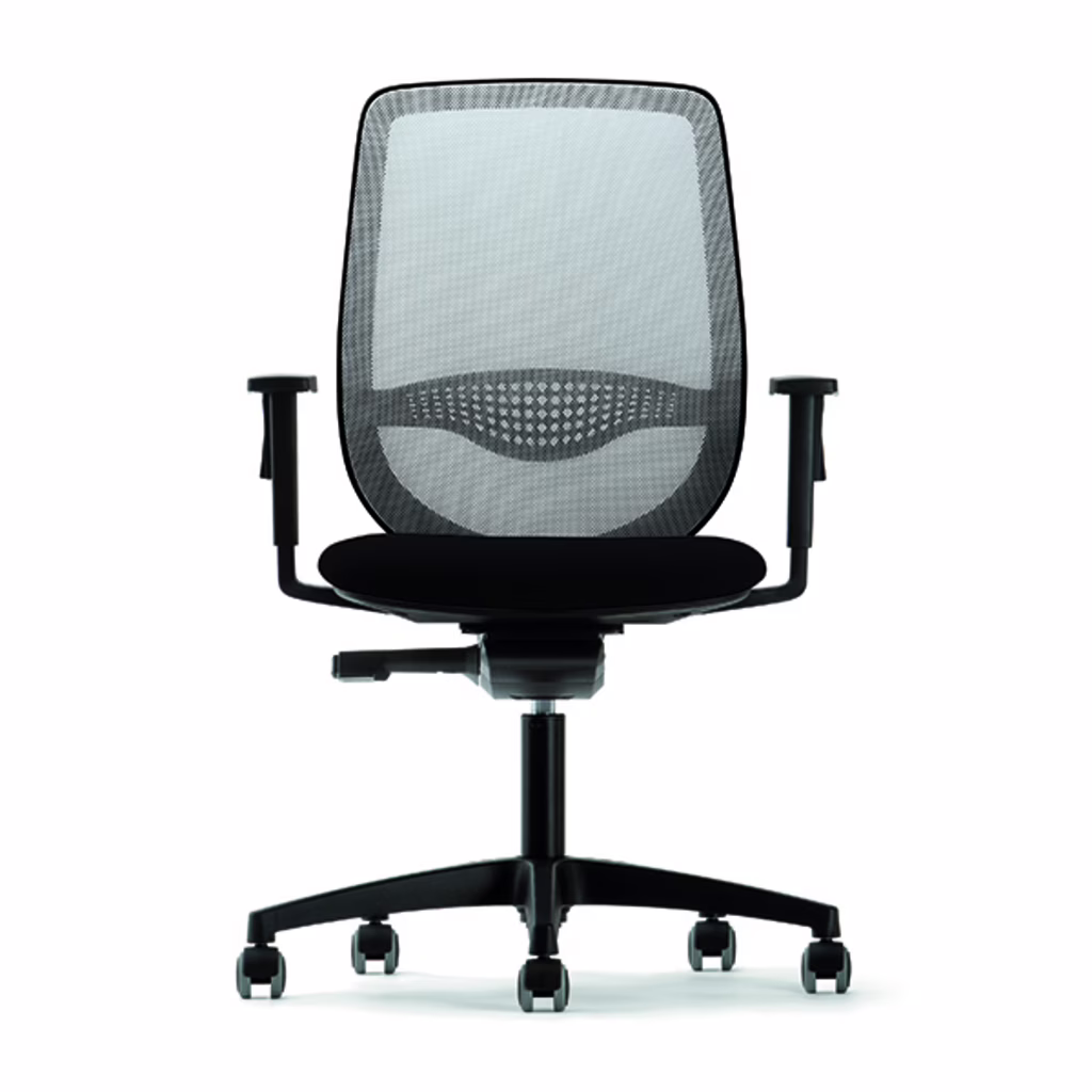 La sedia operativa Okay coniuga comfort e caratteristiche ergonomiche: altezza regolabile, controllo dell'inclinazione, braccioli e supporto lombare - schienale in rete colore nero - Struttura seduta e base a 5 razze in nylon colore nero - Supporto lombare regolabile in altezza integrato nello schienale in tinta con la struttura - Movimento regolato da meccanismo synchronautopesante - Ruote gommate autobloccanti Ø 50 mm - Interno sedile in polipropilene rinforzato con barre in acciaio - Imbottitura sedile spessore 50 mm, densità 30 Kg/m3 - Rivestimento con tessuto ignifugo B01 ad alta resistenza all'abrasione (test usura 100.000 cicli Martindale), lo stesso utilizzato per i pannelli fonoassorbenti LightSound - Conforme al D.lgs 81 e certificata UNI EN1335 in classe" B" - Garanzia 5 anni