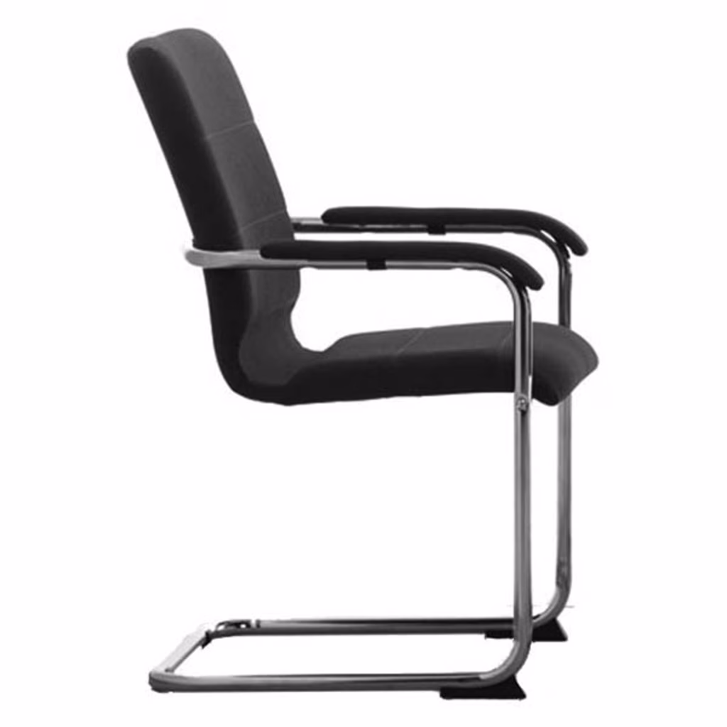 Sedia monoscocca in multistrato di legno - Struttura su slitta in tubo cromato con braccioli integrati nella struttura - Poggiabraccia tappezzato e rivestito - Imbottitura in poliuretano espanso flessibile - Rivestimento in ecopelle Atom di colore nero - Ideale come poltrona interlocutoria oppure abbinata a tavoli riunione