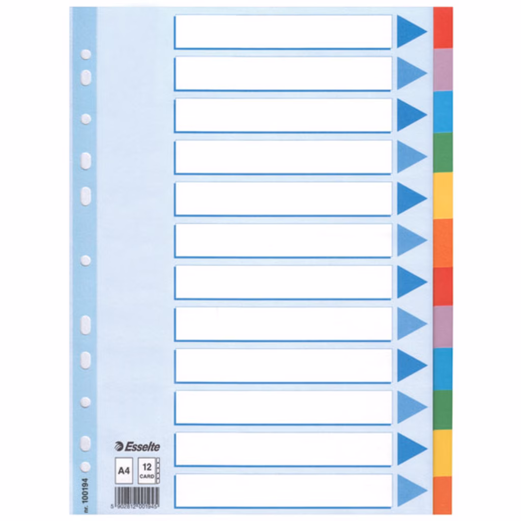 Pagina indice in cartoncino con un design a frecce blu e azzurre e rinforzi in mylar sul lato forato. Tasti a scalino in resistente cartoncino nei brillanti colori Pendaflex. Perforazione universale a 11 fori