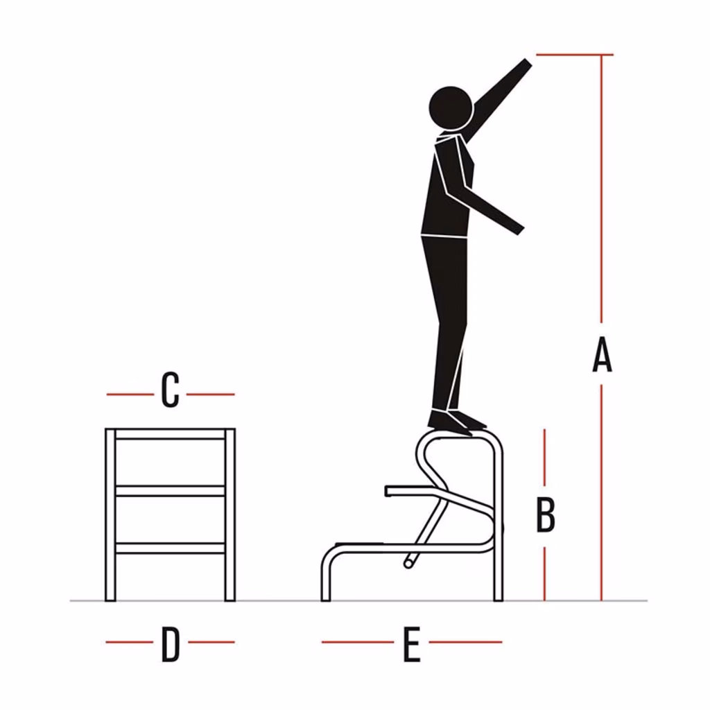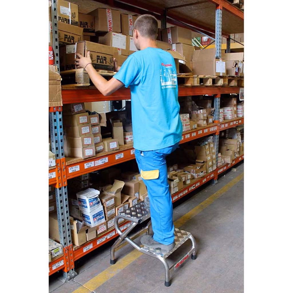 Disponibile da 2 o da 3 gradini - altezza massima di lavoro 2,5 m - costruito secondo la norma EN14183 e il D.L. 81, supera i test di resistenza di oltre 50.000 cicli di lavoro - testato dal Politecnico di Milano, ogni scala è dotata del certificato di conformità e collaudo - gradini antiscivolo da 20 cm - struttura in robusto tubolare di alluminio monocorpo - tappi antiscivolo per maggiore stabilità - COMFORT: Comodo e rapido da spostare