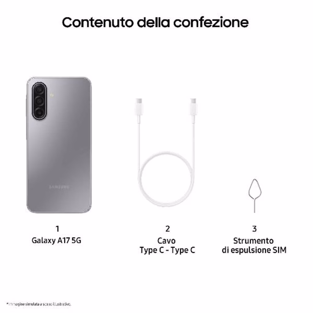 Il Samsung Galaxy A17 offre un ampio display Super AMOLED da 6,7" a 90 Hz per immagini fluide, una fotocamera principale da 50 MP con stabilizzazione ottica per scatti sempre nitidi e una batteria da 5.000 mAh che dura tutto il giorno. Con il suo design elegante e resistente IP54, connettività moderna e aggiornamenti garantiti, unisce prestazioni, stile e affidabilità a un prezzo accessibile.