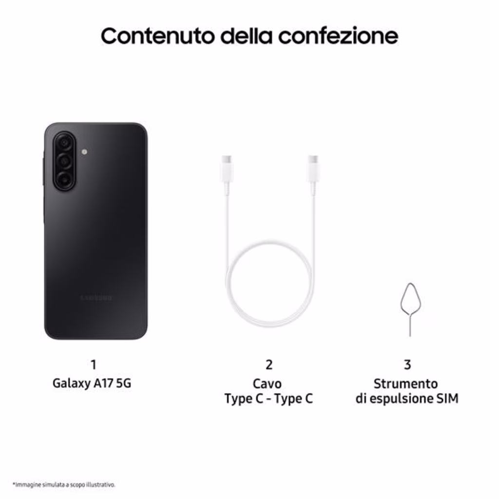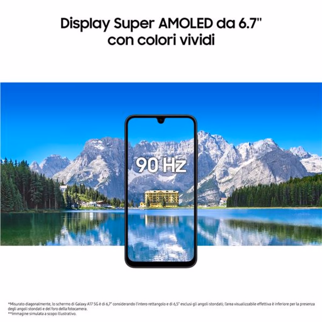 Il Samsung Galaxy A17 offre un ampio display Super AMOLED da 6,7" a 90 Hz per immagini fluide, una fotocamera principale da 50 MP con stabilizzazione ottica per scatti sempre nitidi e una batteria da 5.000 mAh che dura tutto il giorno. Con il suo design elegante e resistente IP54, connettività moderna e aggiornamenti garantiti, unisce prestazioni, stile e affidabilità a un prezzo accessibile.