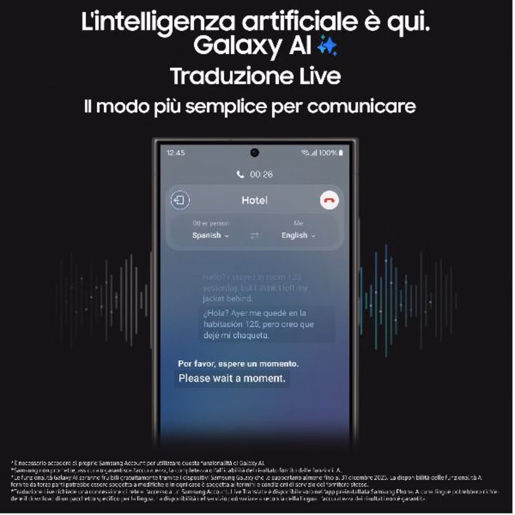 1_Traduzione Live richiede una connesione di rete l'accesso con Samsung Account. Traduzione Live è disponbile solo sull'app Samsung preinstallata. Alcune lingue potrebbero richiedere di scaricare un pacchetto lingua supplementare. La disponibilità del servizio può cambiare a seconda della lingua. La precisione nei risultati non è garantita.