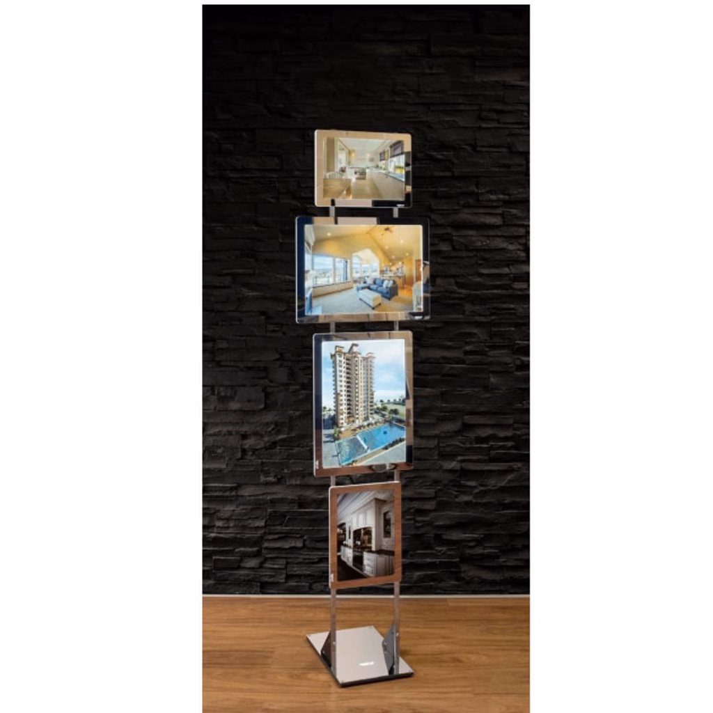 Eleganti strutture in acciaio cromato elettrificate in bassa tensione sulle quali si applicano magneticamente le cornici e gli accessori della linea LEDMAG. La versione Easy Freestanding LEDMAG è quella autoportante, posizionabile liberamente a pavimento, che permette di applicare le cornici su entrambi i lati, aumentando così il numero dei messaggi da esporre. La versione Wall LEDMAG è quella che prevede il fissaggio a muro mediante i tasselli in dotazione ed è fornita di due piastre magnetiche a specchio, che possono, a richiesta, essere personalizzate con il proprio logo retroilluminato. Entrambe le versioni vengono fornite con Trasformatore/Alimentatore 75W-24V. Fornite SENZA CORNICI