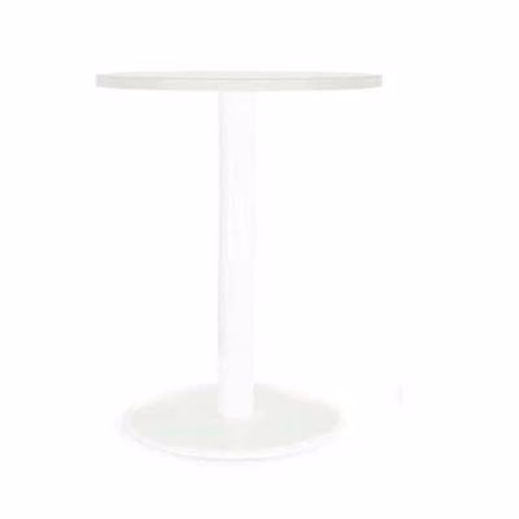 Piano circolare in agglomerato ligneo nobilitato melaminico bianco, colonna (Ø 8cm) e base (Ø 49cm) in metallo verniciato bianco - Altezza 115 cm.