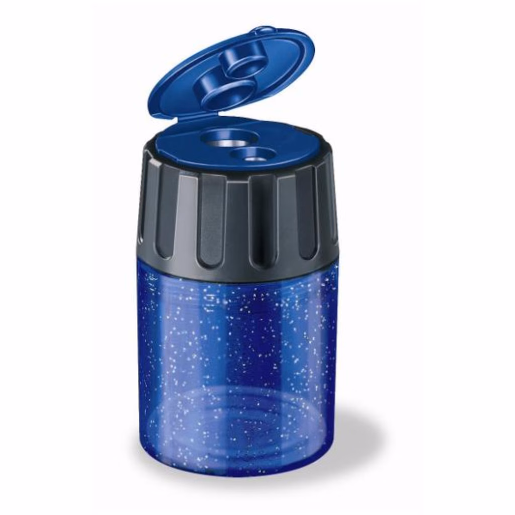 Temperamatite a due fori con contenitore per trucioli, per matite nere e colorate fino a 11 mm diam, assortito nei colori blu/rosso/grigio trasparente.