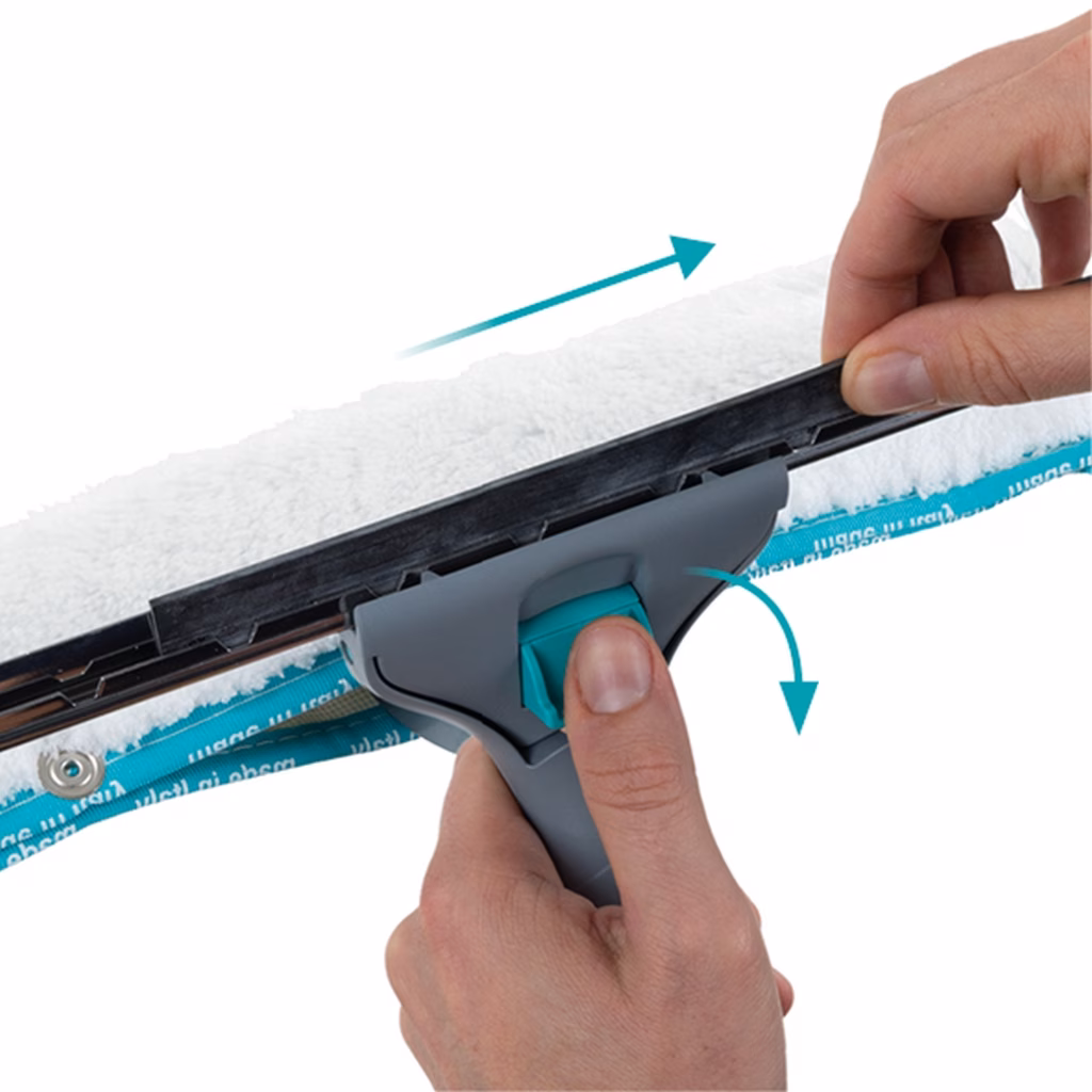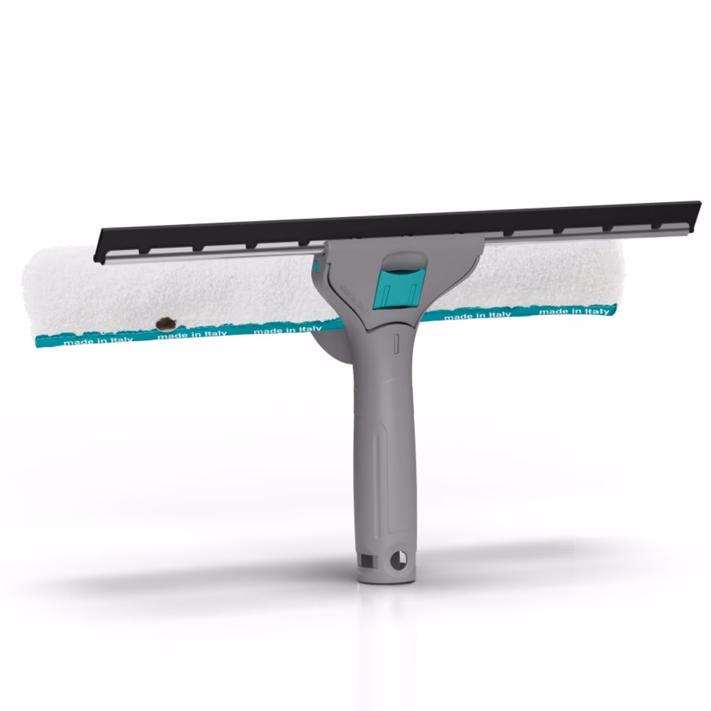 Tergivetro in poliammide con lamina intercambiabile, leva di blocco e attacco sistema Lampo e supporto vello in alluminio con ricambio vello in microfibra - un solo strumento, due operazioni: è sufficiente ruotare l'attrezzo per lavare o asciugare la superficie risparmiando tempo