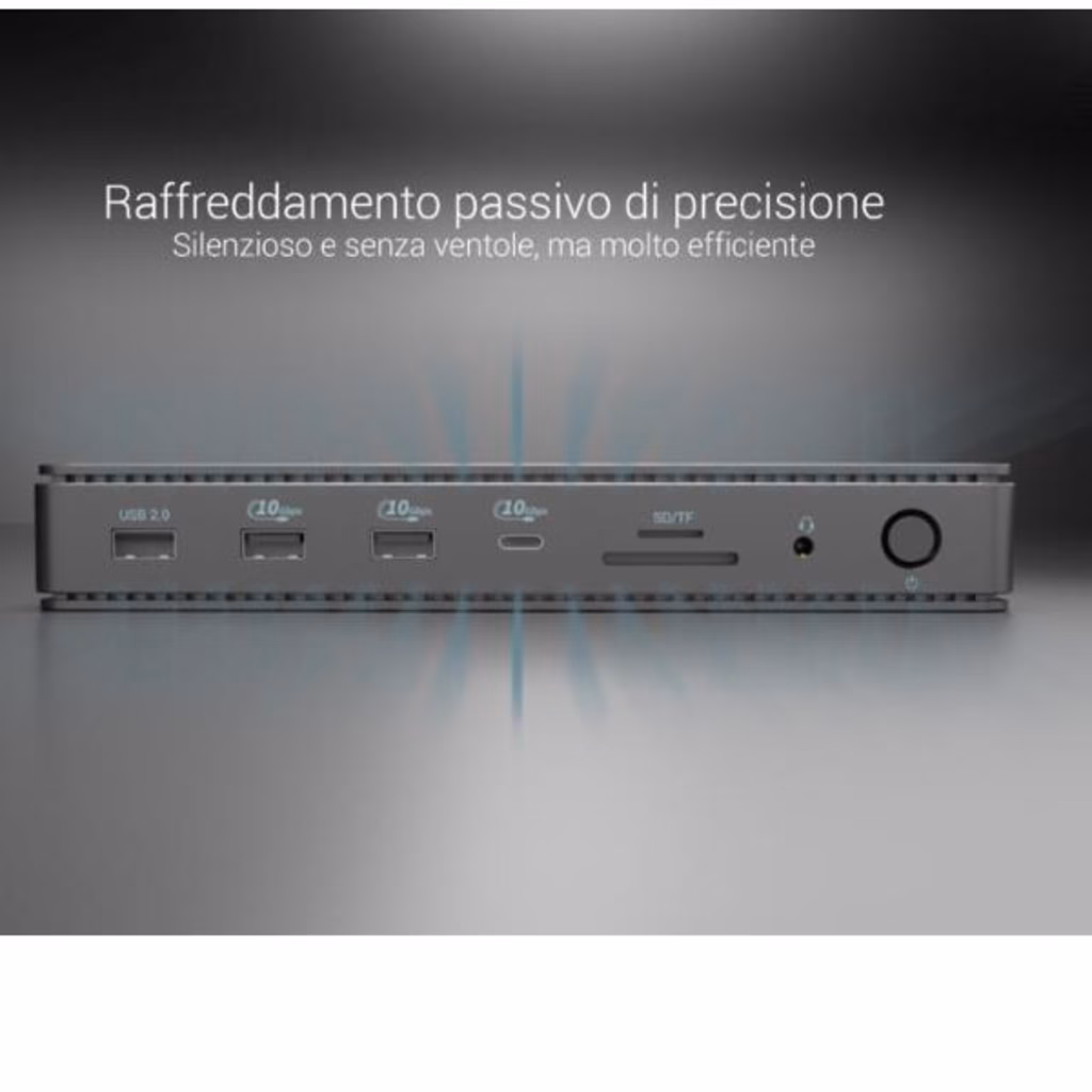 Grazie al protocollo DP 1.4 integrato, è possibile collegare questo dock a un monitor con una risoluzione fino a 8K (7680 x 4320) con una frequenza di aggiornamento di 30 Hz, che equivale alla risoluzione di quattro monitor, ciascuno con risoluzione 4K. È quindi la soluzione ideale per grafici, analisti, sviluppatori, montatori cinematografici o appassionati di video ad alta definizione.