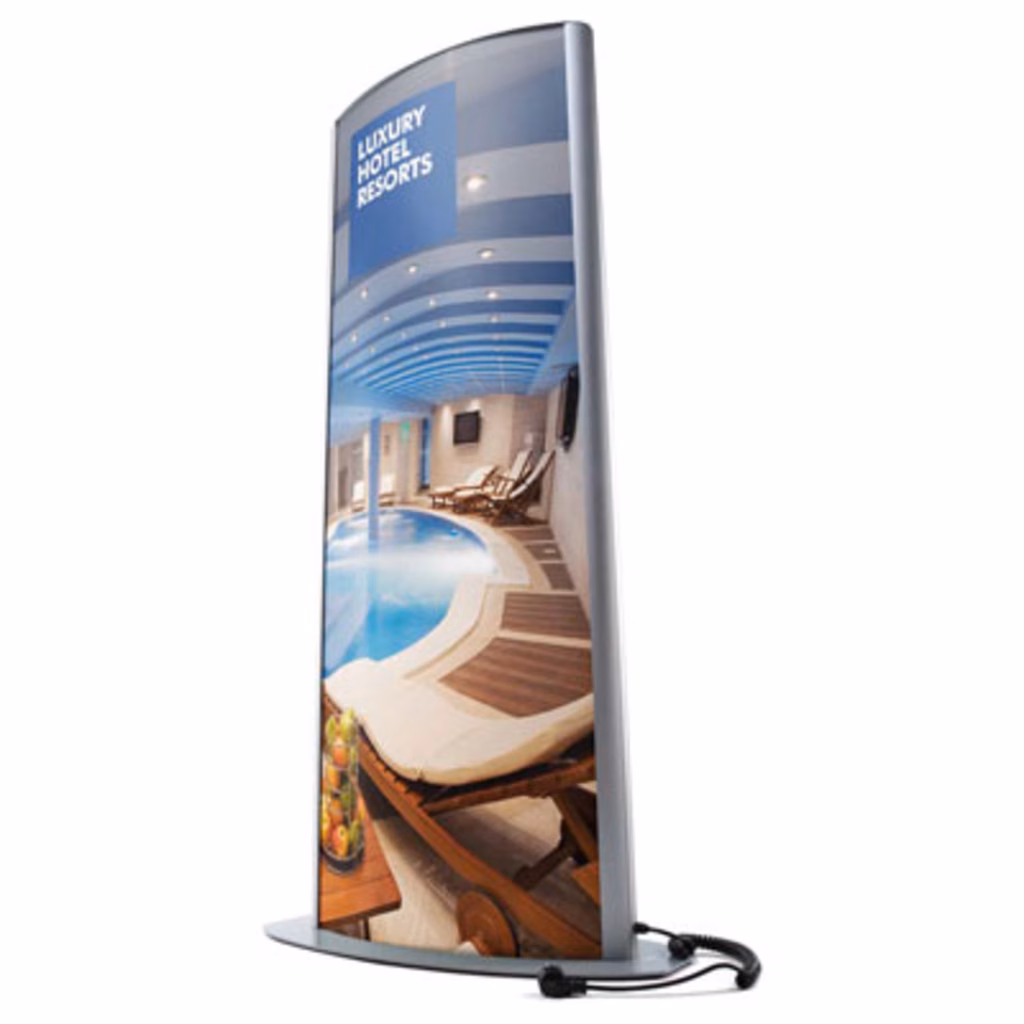 Totem luminoso arcuato led da interno dal design convesso - profili a scatto (apribili) sui montanti laterali realizzati in alluminio silver - totem di alta qualità - base realizzata in acciaio verniciato a polvere per una migliore stabilità - la protezione antiriflesso per i poster ha i bordi piegati che consentono un facile inserimento e allineamento della grafica - completo di alimentatore a basso voltaggio - certificato secondo le normative ce - fornito completamente assemblato per un uso immediato - ottima illuminazione grazie alla forma convessa