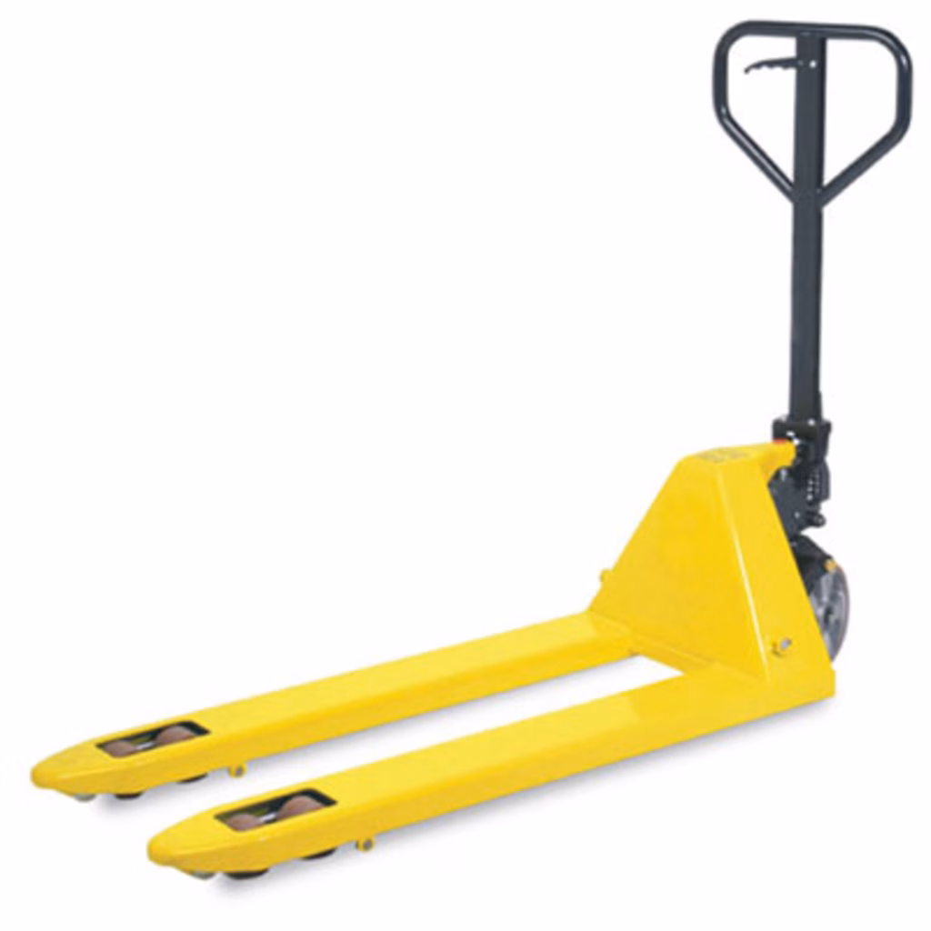 Transpallet a 4 rulli singoli con forche standard da 115 cm e ruote direttrici in gomma nera - capacità: kg 2.200 - dotato di valvola di massima pressione che blocca automaticamente il sollevamento delle forche, quando viene superata la massima capacità di carico - verniciatura in polvere di poliestere a 250° garantisce grande resistenza all'usura e agli agenti atmosferici.