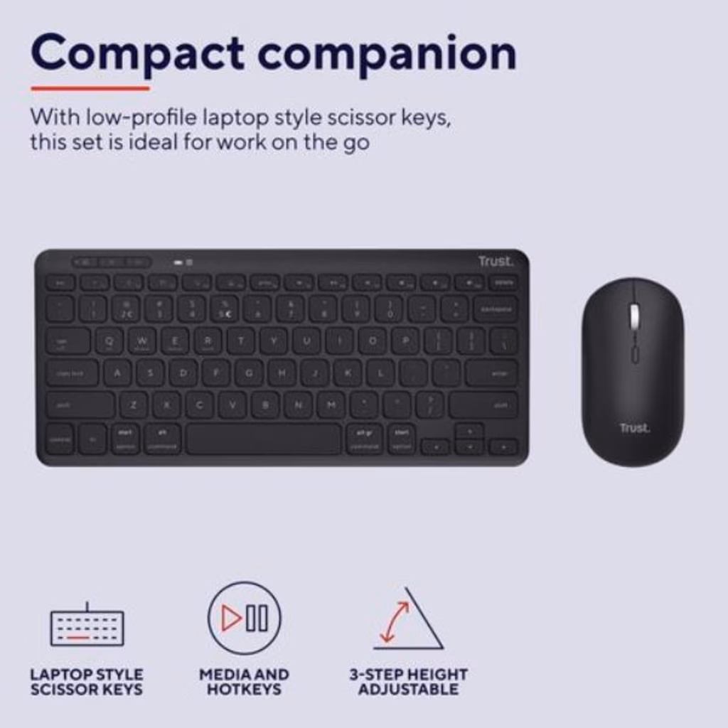 Un basso profiloIdeale per viaggiatori e pendolari (o chiunque voglia semplicemente una tastiera più piccola!), Lyra è dotata di tasti compatti e bassi, stile laptop, e un piede regolabile a 3 altezze. Il mouse è anche piccolo e robusto: un set ideale per lavorare in ufficio, a casa e in viaggio.