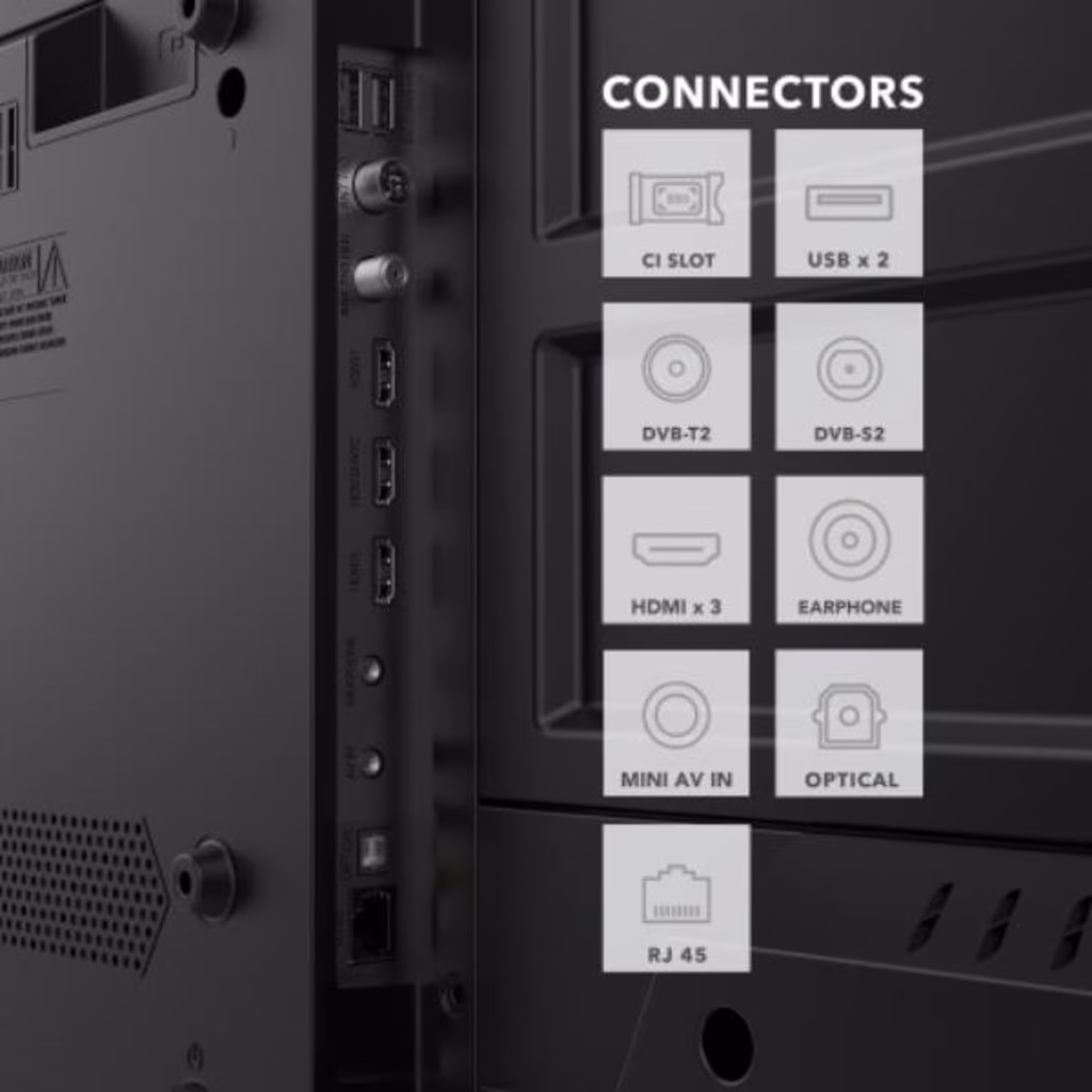 Dispone di Wi-Fi dual band, Bluetooth 5.1, tre porte HDMI, due USB, ingresso AV, uscita ottica e porta LAN. Supporta anche slot CI+ per schede pay TV. Tutto ciò che serve per collegare console, decoder, soundbar o hard disk.