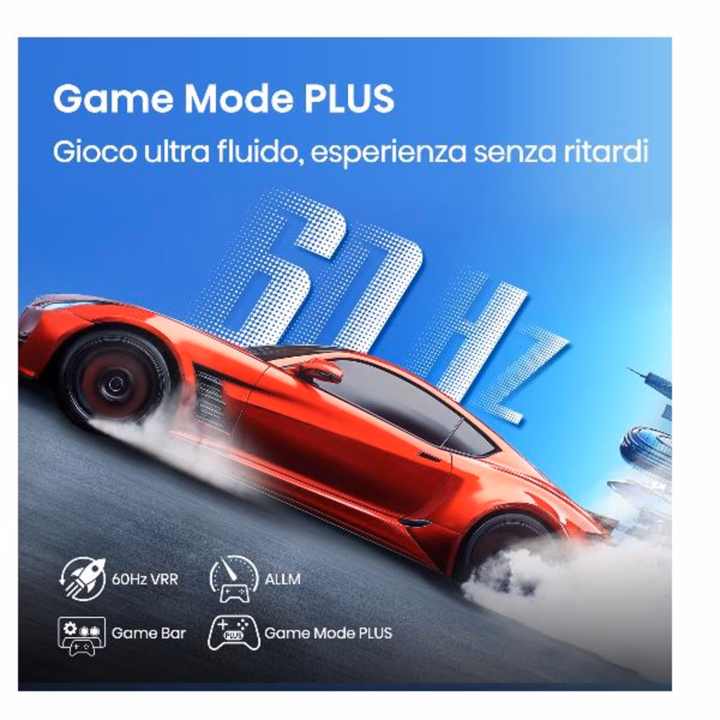 Migliora la tua esperienza di gioco con la modalità di gioco PLUS con una barra di gioco come centro di controllo integrato. VRR e ALLM riducono l'input lag ed eliminano lo screen strappo. Goditi il ??gameplay fluido su una TV a prezzi ragionevoli!