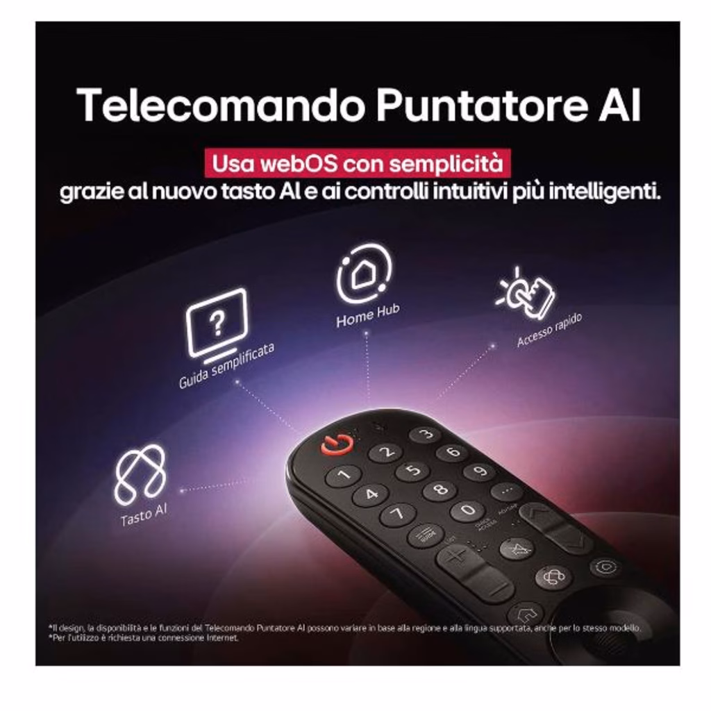 Il rivoluzionario Telecomando Puntatore AI porta l'interazione con il tuo dispositivo a un livello superiore grazie alla presenza del nuovo tasto AI, che semplifica e accelera l'accesso alle funzioni più avanzate. Oltre ai comandi vocali, che permettono un controllo ancora più intuitivo, il telecomando offre anche la funzionalità drag & drop, che consente di navigare e spostare contenuti più facilmente.